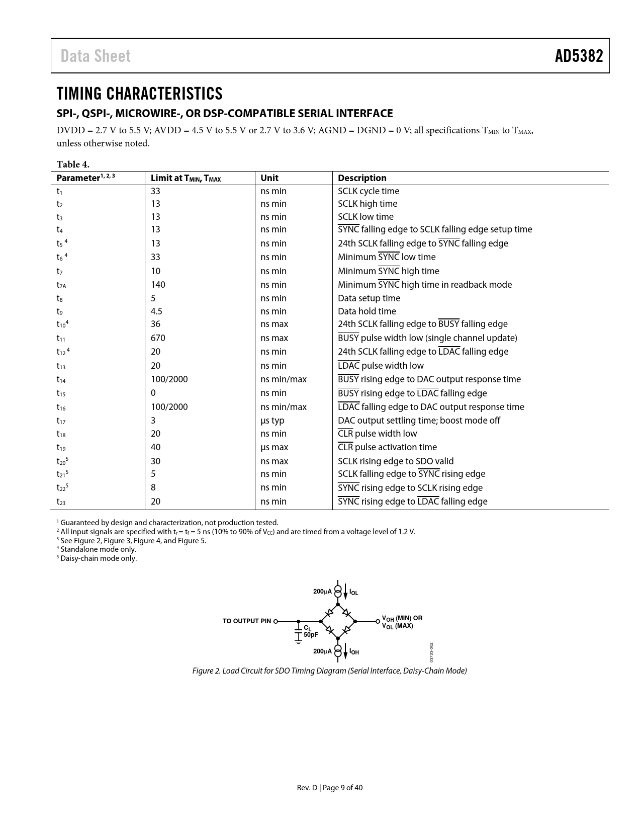 link to page 10 link to page 10 link to page 10 link to page 10 link to page 10 link to page 10 link to page 11 link to page 11 link to page 12 link to page 10 link to page 10 link to page 10 link to page 10 link to page 10 Data SheetAD5382TIMING CHARACTERISTICS SPI-, QSPI-, MICROWIRE-, OR DSP-COMPATIBLE SERIAL INTERFACE DVDD = 2.7 V to 5.5 V; AVDD = 4.5 V to 5.5 V or 2.7 V to 3.6 V; AGND = DGND = 0 V; all specifications TMIN to TMAX, unless otherwise noted. Table 4. Parameter1, 2, 3Limit at TMIN, TMAX UnitDescription t1 33 ns min SCLK cycle time t2 13 ns min SCLK high time t3 13 ns min SCLK low time t4 13 ns min SYNC falling edge to SCLK falling edge setup time t5 4 13 ns min 24th SCLK falling edge to SYNC falling edge t6 4 33 ns min Minimum SYNC low time t7 10 ns min Minimum SYNC high time t7A 140 ns min Minimum SYNC high time in readback mode t8 5 ns min Data setup time t9 4.5 ns min Data hold time t 4 10 36 ns max 24th SCLK falling edge to BUSY falling edge t11 670 ns max BUSY pulse width low (single channel update) t 4 12 20 ns min 24th SCLK falling edge to LDAC falling edge t13 20 ns min LDAC pulse width low t14 100/2000 ns min/max BUSY rising edge to DAC output response time t15 0 ns min BUSY rising edge to LDAC falling edge t16 100/2000 ns min/max LDAC falling edge to DAC output response time t17 3 μs typ DAC output settling time; boost mode off t18 20 ns min CLR pulse width low t19 40 μs max CLR pulse activation time t 5 20 30 ns max SCLK rising edge to SDO valid t 5 21 5 ns min SCLK falling edge to SYNC rising edge t 5 22 8 ns min SYNC rising edge to SCLK rising edge t23 20 ns min SYNC rising edge to LDAC falling edge 1 Guaranteed by design and characterization, not production tested. 2 All input signals are specified with tr = tf = 5 ns (10% to 90% of VCC) and are timed from a voltage level of 1.2 V. 3 See Figure 2, Figure 3, Figure 4, and Figure 5. 4 Standalone mode only. 5 Daisy-chain mode only. 200 AIOLTO OUTPUT PINVOH (MIN) ORCVLOL (MAX)50pF 02 200 AI -0 OH 03733 Figure 2. Load Circuit for SDO Timing Diagram (Serial Interface, Daisy-Chain Mode) Rev. D | Page 9 of 40 Document Outline Features Integrated Functions Applications Functional Block Diagram Table of Contents Revision History General Description Specifications AD5382-5 Specifications AD5382-3 Specifications AC Characteristics Timing Characteristics SPI-, QSPI-, MICROWIRE-, or DSP-Compatible Serial Interface I2C Serial Interface Parallel Interface Absolute Maximum Ratings ESD Caution Pin Configuration and Function Descriptions Terminology Typical Performance Characteristics Functional Description DAC Architecture—General Data Decoding On-Chip Special Function Registers (SFR) SFR Commands NOP (No Operation) Write Clear Code Soft Clear Soft Power-Down Soft Power-Up Soft RESET Control Register Write/Read Control Register Contents Channel Monitor Function Hardware Functions Reset Function Asynchronous Clear Function BUSY\ and LDAC\ Functions FIFO Operation in Parallel Mode Power-On Reset Power-Down AD5382 Interfaces DSP-, SPI-, MICROWIRE-Compatible Serial Interfaces Standalone Mode Daisy-Chain Mode Readback Mode I2C Serial Interface I2C Data Transfer Start and Stop Conditions Repeated Start Conditions Acknowledge Bit (ACK) AD5382 Slave Addresses Write Operation 4-Byte Mode 3-Byte Mode 2-Byte Mode Parallel Interface CS\ Pin WR\ Pin REG0, REG1 Pins Pins A4 to A0 Pins DB13 to DB0 Microprocessor Interfacing Parallel Interface AD5382 to MC68HC11 AD5382 to PIC16C6x/7x AD5382 to 8051 AD5382 to ADSP-BF527 Applications Information Power Supply Decoupling Power Supply Sequencing Typical Configuration Circuit Monitor Function Toggle Mode Function Thermal Monitor Function AD5382 in a MEMS-Based Optical Switch Optical Attenuators Outline Dimensions Ordering Guide