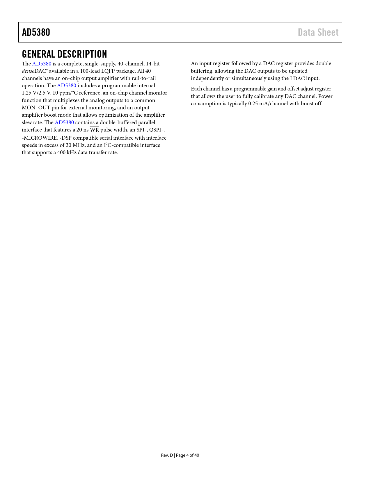 AD5380Data SheetGENERAL DESCRIPTION The AD5380 is a complete, single-supply, 40-channel, 14-bit An input register followed by a DAC register provides double denseDAC® available in a 100-lead LQFP package. All 40 buffering, allowing the DAC outputs to be updated channels have an on-chip output amplifier with rail-to-rail independently or simultaneously using the LDAC input. operation. The AD5380 includes a programmable internal Each channel has a programmable gain and offset adjust register 1.25 V/2.5 V, 10 ppm/°C reference, an on-chip channel monitor that al ows the user to fully calibrate any DAC channel. Power function that multiplexes the analog outputs to a common consumption is typically 0.25 mA/channel with boost off. MON_OUT pin for external monitoring, and an output amplifier boost mode that al ows optimization of the amplifier slew rate. The AD5380 contains a double-buffered parallel interface that features a 20 ns WR pulse width, an SPI-, QSPI-, -MICROWIRE, -DSP compatible serial interface with interface speeds in excess of 30 MHz, and an I2C-compatible interface that supports a 400 kHz data transfer rate. Rev. D | Page 4 of 40 Document Outline Features Integrated Functions Applications Functional Block Diagram Table Of Contents Revision History General Description Specifications AD5380-5 Specifications AD5380-3 Specifications AC Characteristics Timing Characteristics Serial Interface I2C Serial Interface Parallel Interface Absolute Maximum Ratings ESD Caution Pin Configuration and Function Descriptions Terminology Typical Performance Characteristics Functional Description DAC Architecture—General Data Decoding On-Chip Special Function Registers (SFR) SFR Commands NOP (No Operation) Write CLR Code Soft CLR Soft Power-Down Soft Power-Up Soft RESET Control Register Write/Read Control Register Contents Channel Monitor Function Hardware Functions RESET\ Function Asynchronous Clear Function BUSY\ and LDAC\ Functions FIFO Operation in Parallel Mode Power-On Reset Power-Down AD5380 Interfaces DSP-, SPI-, Microwire-Compatible Serial Interfaces Standalone Mode Daisy-Chain Mode Readback Mode I2C Serial Interface I2C Data Transfer START and STOP Conditions Repeated START Conditions Acknowledge Bit (ACK) AD5380 Slave Addresses Write Operation 4-Byte Mode 3-Byte Mode 2-Byte Mode Parallel Interface CS\ Pin WR\ Pin REG0, REG1 Pins Pins A5 to A0 Pins DB13 to DB0 Microprocessor Interfacing Parallel Interface AD5380 to MC68HC11 AD5380 to PIC16C6x/7x AD5380 to 8051 AD5380 to ADSP-BF527 Applications Information Power Supply Decoupling Power Supply Sequencing Typical Configuration Circuit AD5380 Monitor Function Toggle Mode Function Thermal Monitor Function AD5380 in a MEMS Based Optical Switch Optical Attenuators Utilizing the AD5380 FIFO Outline Dimensions Ordering Guide