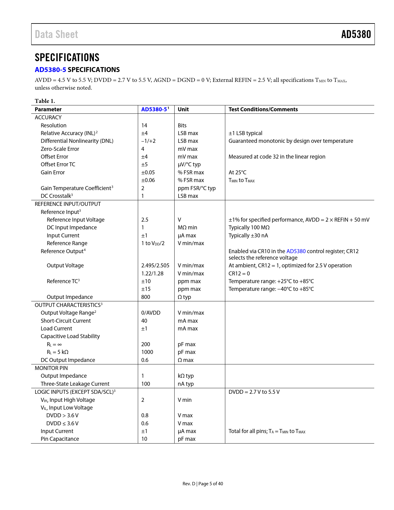 Data Sheet. AD5380. SPECIFICATIONS AD5380-5 S. PECIFICATIONS. Table 1. Parameter. AD5380-5. Unit. Test Conditions/Comments