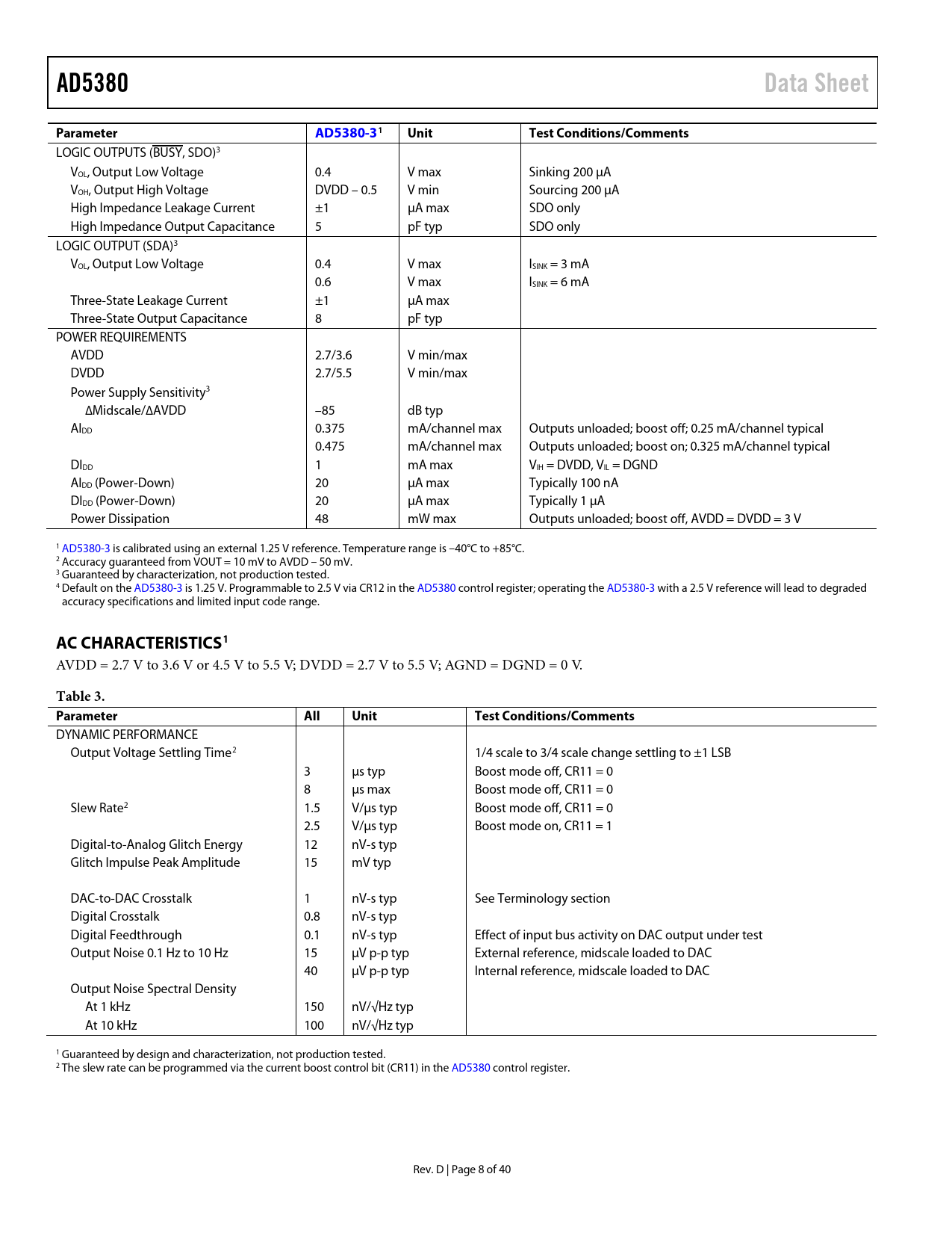 AD5380 Data Sheet Parameter AD5380-31 Unit Test Conditions/Comments AC CHARACTERISTICS1 Table 3 Parameter All