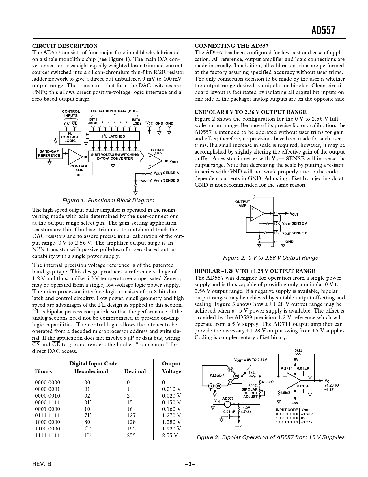 AD557. CIRCUIT DESCRIPTION. CONNECTING THE AD557. CONTROL. DIGITAL INPUT DATA (BUS). UNIPOLAR 0 V TO 2.56 V OUTPUT RANGE. INPUTS