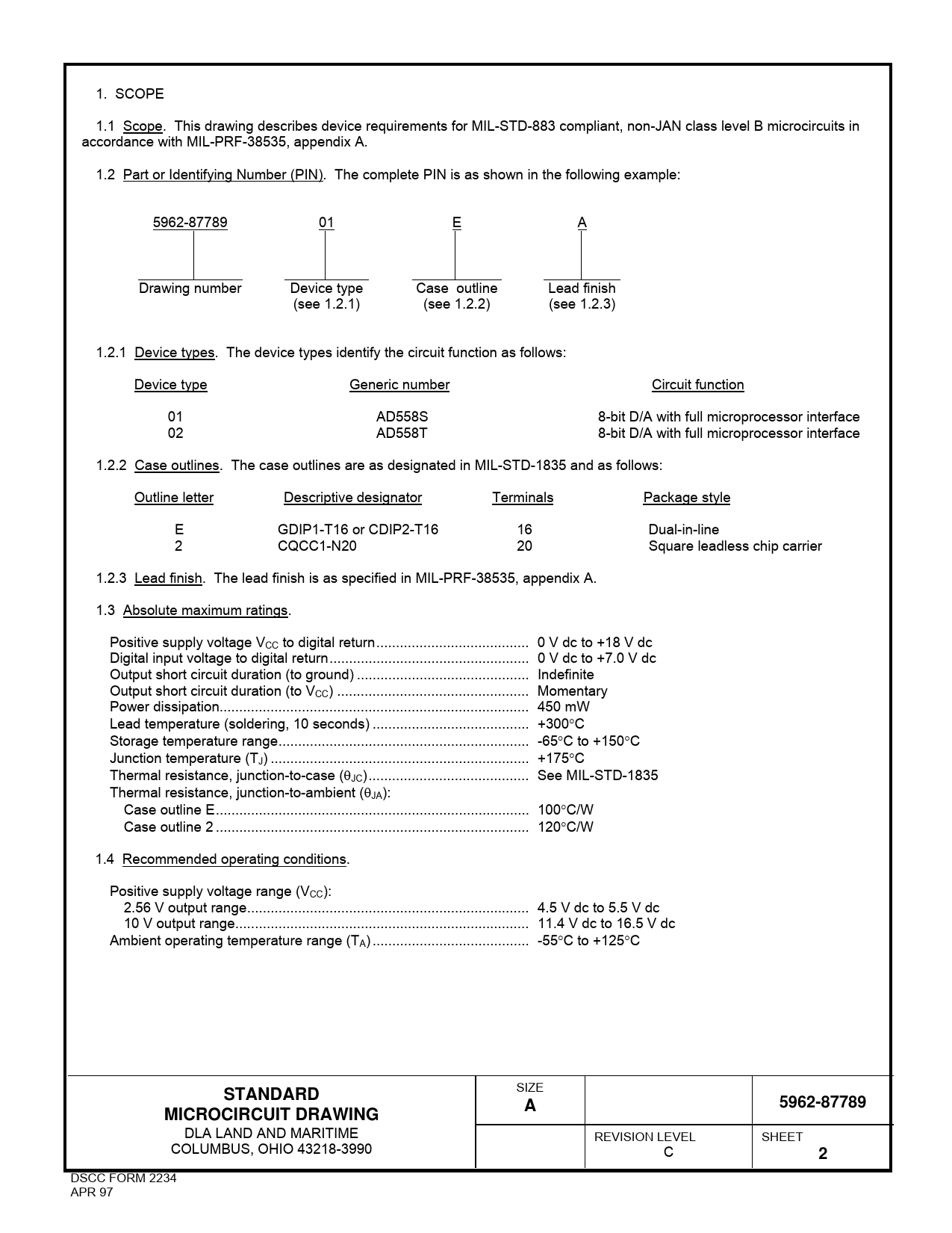 1. SCOPE 1.1 Scope. This drawing describes device requirements for MIL-STD-883 compliant, non-JAN class level B microcircuits in accordance with MIL-PRF-38535, appendix A. 1.2 Part or Identifying Number (PIN). The complete PIN is as shown in the following example: 5962-87789 01 E A Drawing number Device type Case outline Lead finish (see 1.2.1) (see 1.2.2) (see 1.2.3) 1.2.1 Device types. The device types identify the circuit function as follows: Device type Generic number Circuit function 01 AD558S 8-bit D/A with full microprocessor interface 02 AD558T 8-bit D/A with full microprocessor interface 1.2.2 Case outlines. The case outlines are as designated in MIL-STD-1835 and as follows: Outline letter Descriptive designator Terminals Package style E GDIP1-T16 or CDIP2-T16 16 Dual-in-line 2 CQCC1-N20 20 Square leadless chip carrier 1.2.3 Lead finish. The lead finish is as specified in MIL-PRF-38535, appendix A. 1.3 Absolute maximum ratings. Positive supply voltage VCC to digital return ... 0 V dc to +18 V dc Digital input voltage to digital return ... 0 V dc to +7.0 V dc Output short circuit duration (to ground) .. Indefinite Output short circuit duration (to VCC) ... Momentary Power dissipation... 450 mW Lead temperature (soldering, 10 seconds) .. +300C Storage temperature range .. -65C to +150C Junction temperature (TJ) .. +175C Thermal resistance, junction-to-case (JC) ... See MIL-STD-1835 Thermal resistance, junction-to-ambient (JA): Case outline E .. 100C/W Case outline 2 .. 120C/W 1.4 Recommended operating conditions. Positive supply voltage range (VCC): 2.56 V output range .. 4.5 V dc to 5.5 V dc 10 V output range ... 11.4 V dc to 16.5 V dc Ambient operating temperature range (TA) .. -55C to +125C SIZE STANDARDA5962-87789MICROCIRCUIT DRAWING DLA LAND AND MARITIME REVISION LEVEL SHEET COLUMBUS, OHIO 43218-3990 C 2 DSCC FORM 2234 APR 97