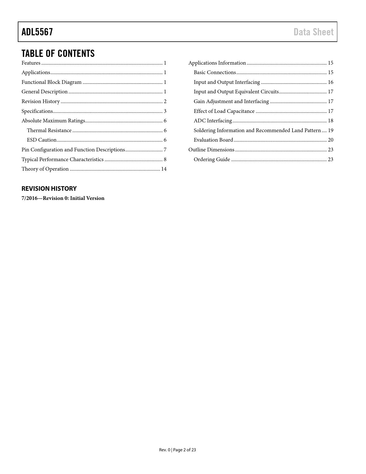 ADL5567 Data Sheet TABLE OF CONTENTS REVISION HISTORY 7/2016—Revision 0: Initial Version