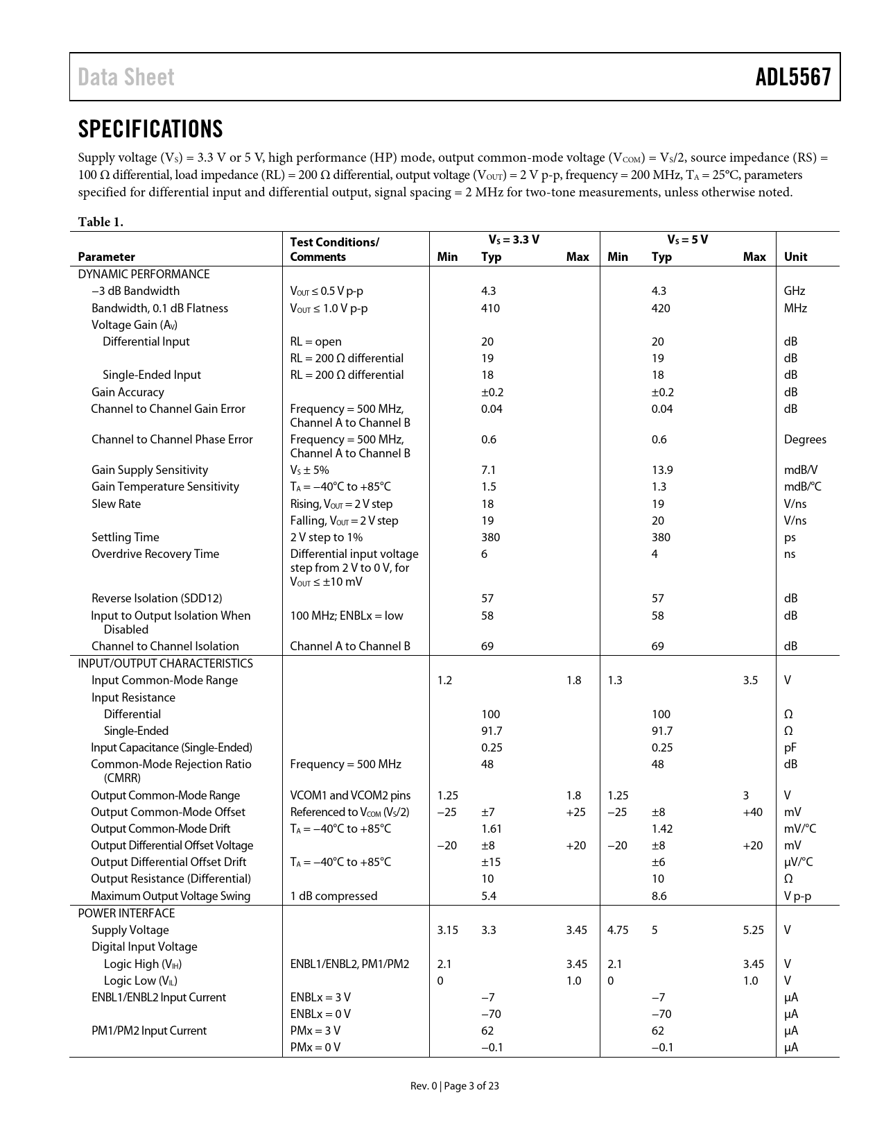 Data SheetADL5567SPECIFICATIONS Supply voltage (VS) = 3.3 V or 5 V, high performance (HP) mode, output common-mode voltage (VCOM) = VS/2, source impedance (RS) = 100 Ω differential, load impedance (RL) = 200 Ω differential, output voltage (VOUT) = 2 V p-p, frequency = 200 MHz, TA = 25°C, parameters specified for differential input and differential output, signal spacing = 2 MHz for two-tone measurements, unless otherwise noted. Table 1.Test Conditions/VS = 3.3 VVS = 5 VParameterCommentsMinTypMaxMinTypMaxUnit DYNAMIC PERFORMANCE −3 dB Bandwidth VOUT ≤ 0.5 V p-p 4.3 4.3 GHz Bandwidth, 0.1 dB Flatness VOUT ≤ 1.0 V p-p 410 420 MHz Voltage Gain (AV) Differential Input RL = open 20 20 dB RL = 200 Ω differential 19 19 dB Single-Ended Input RL = 200 Ω differential 18 18 dB Gain Accuracy ±0.2 ±0.2 dB Channel to Channel Gain Error Frequency = 500 MHz, 0.04 0.04 dB Channel A to Channel B Channel to Channel Phase Error Frequency = 500 MHz, 0.6 0.6 Degrees Channel A to Channel B Gain Supply Sensitivity VS ± 5% 7.1 13.9 mdB/V Gain Temperature Sensitivity TA = −40°C to +85°C 1.5 1.3 mdB/°C Slew Rate Rising, VOUT = 2 V step 18 19 V/ns Falling, VOUT = 2 V step 19 20 V/ns Settling Time 2 V step to 1% 380 380 ps Overdrive Recovery Time Differential input voltage 6 4 ns step from 2 V to 0 V, for VOUT ≤ ±10 mV Reverse Isolation (SDD12) 57 57 dB Input to Output Isolation When 100 MHz; ENBLx = low 58 58 dB Disabled Channel to Channel Isolation Channel A to Channel B 69 69 dB INPUT/OUTPUT CHARACTERISTICS Input Common-Mode Range 1.2 1.8 1.3 3.5 V Input Resistance Differential 100 100 Ω Single-Ended 91.7 91.7 Ω Input Capacitance (Single-Ended) 0.25 0.25 pF Common-Mode Rejection Ratio Frequency = 500 MHz 48 48 dB (CMRR) Output Common-Mode Range VCOM1 and VCOM2 pins 1.25 1.8 1.25 3 V Output Common-Mode Offset Referenced to VCOM (VS/2) −25 ±7 +25 −25 ±8 +40 mV Output Common-Mode Drift TA = −40°C to +85°C 1.61 1.42 mV/°C Output Differential Offset Voltage −20 ±8 +20 −20 ±8 +20 mV Output Differential Offset Drift TA = −40°C to +85°C ±15 ±6 µV/°C Output Resistance (Differential) 10 10 Ω Maximum Output Voltage Swing 1 dB compressed 5.4 8.6 V p-p POWER INTERFACE Supply Voltage 3.15 3.3 3.45 4.75 5 5.25 V Digital Input Voltage Logic High (VIH) ENBL1/ENBL2, PM1/PM2 2.1 3.45 2.1 3.45 V Logic Low (VIL) 0 1.0 0 1.0 V ENBL1/ENBL2 Input Current ENBLx = 3 V −7 −7 µA ENBLx = 0 V −70 −70 µA PM1/PM2 Input Current PMx = 3 V 62 62 µA PMx = 0 V −0.1 −0.1 µA Rev. 0 | Page 3 of 23 Document Outline FEATURES APPLICATIONS FUNCTIONAL BLOCK DIAGRAM GENERAL DESCRIPTION REVISION HISTORY SPECIFICATIONS ABSOLUTE MAXIMUM RATINGS THERMAL RESISTANCE ESD CAUTION PIN CONFIGURATION AND FUNCTION DESCRIPTIONS TYPICAL PERFORMANCE CHARACTERISTICS THEORY OF OPERATION APPLICATIONS INFORMATION BASIC CONNECTIONS INPUT AND OUTPUT INTERFACING Single-Ended Input to Differential Output INPUT AND OUTPUT EQUIVALENT CIRCUITS GAIN ADJUSTMENT AND INTERFACING EFFECT OF LOAD CAPACITANCE ADC INTERFACING SOLDERING INFORMATION AND RECOMMENDED LAND PATTERN EVALUATION BOARD OUTLINE DIMENSIONS ORDERING GUIDE