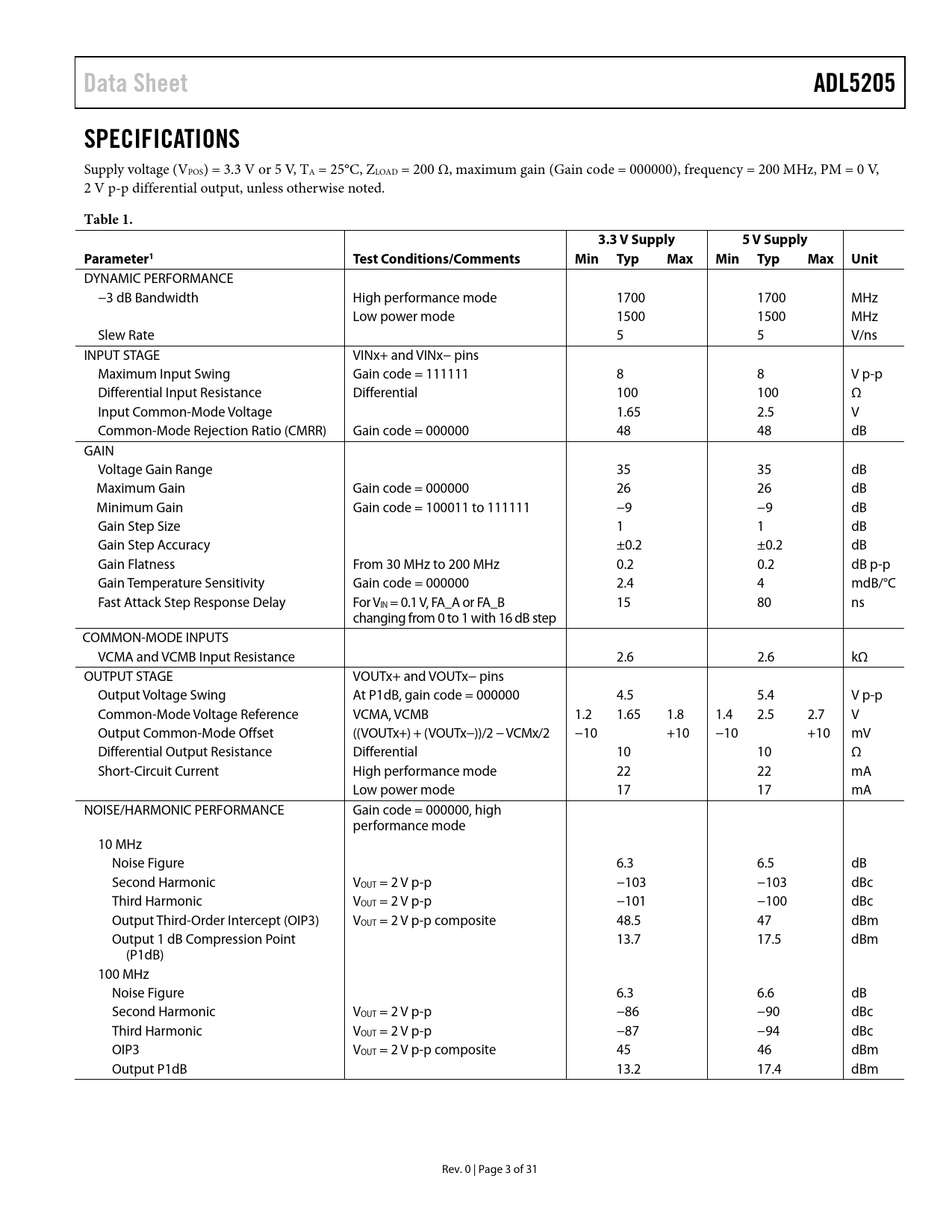Data Sheet. ADL5205. SPECIFICATIONS. Table 1. 3.3 V Supply. 5 V Supply. Parameter1. Test Conditions/Comments. Min. Typ. Max. Unit