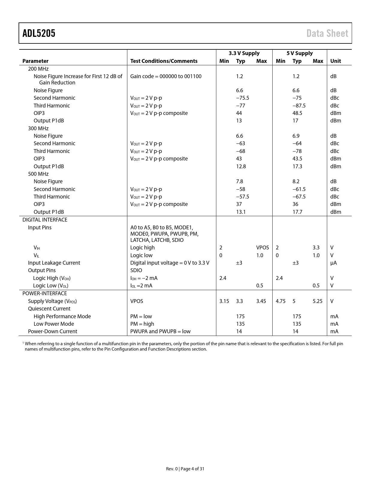 200 MHz Noise Figure Increase for First 12 dB of Gain code = 000000 to 001100 1.2 1.2 dB Gain Reduction Noise Figure 6.6 6.6 dB Second Harmonic VOUT = 2 V p-p −75.5 −75 dBc Third Harmonic VOUT = 2 V p-p −77 −87.5 dBc OIP3 VOUT = 2 V p-p composite 44 48.5 dBm Output P1dB 13 17 dBm 300 MHz Noise Figure 6.6 6.9 dB Second Harmonic VOUT = 2 V p-p −63 −64 dBc Third Harmonic VOUT = 2 V p-p −68 −78 dBc OIP3 VOUT = 2 V p-p composite 43 43.5 dBm Output P1dB 12.8 17.3 dBm 500 MHz Noise Figure 7.8 8.2 dB Second Harmonic VOUT = 2 V p-p −58 −61.5 dBc Third Harmonic VOUT = 2 V p-p −57.5 −67.5 dBc OIP3 VOUT = 2 V p-p composite 37 36 dBm Output P1dB 13.1 17.7 dBm DIGITAL INTERFACE Input Pins A0 to A5, B0 to B5, MODE1, MODE0, PWUPA, PWUPB, PM, LATCHA, LATCHB, SDIO VIH Logic high 2 VPOS 2 3.3 V VIL Logic low 0 1.0 0 1.0 V Input Leakage Current Digital input voltage = 0 V to 3.3 V ±3 ±3 µA Output Pins SDIO Logic High (VOH) IOH = −2 mA 2.4 2.4 V Logic Low (VOL) IOL =2 mA 0.5 0.5 V POWER-INTERFACE Supply Voltage (VPOS) VPOS 3.15 3.3 3.45 4.75 5 5.25 V Quiescent Current High Performance Mode PM = low 175 175 mA Low Power Mode PM = high 135 135 mA Power-Down Current PWUPA and PWUPB = low 14 14 mA 1 When referring to a single function of a multifunction pin in the parameters, only the portion of the pin name that is relevant to the specification is listed. For full pin names of multifunction pins, refer to the Pin Configuration and Function Descriptions section. Rev. 0 | Page 4 of 31 Document Outline FEATURES APPLICATIONS FUNCTIONAL BLOCK DIAGRAM GENERAL DESCRIPTION REVISION HISTORY SPECIFICATIONS TIMING SPECIFICATIONS Timing Diagrams ABSOLUTE MAXIMUM RATINGS THERMAL RESISTANCE JUNCTION TO BOARD THERMAL IMPEDANCE ESD CAUTION PIN CONFIGURATION AND FUNCTION DESCRIPTIONS TYPICAL PERFORMANCE CHARACTERISTICS THEORY OF OPERATION BASIC STRUCTURE CONTROL/LOGIC CIRCUITRY COMMON-MODE VOLTAGE APPLICATIONS INFORMATION BASIC CONNECTIONS DIGITAL INTERFACE OVERVIEW Parallel Digital Interface Serial Peripheral Interface (SPI) Up/Down Interface SPI READ ADC INTERFACING NOISE FIGURE vs. GAIN SETTING EVALUATION BOARD OVERVIEW POWER SUPPLY INTERFACE SIGNAL INPUTS AND OUTPUTS MANUAL CONTROLS Mode Switches Channel Control Switches PARALLEL INTERFACE SERIAL INTERFACE STANDARD DEVELOPMENT PLATFORM (SDP) INTERFACE EVALUATION BOARD CONTROL SOFTWARE COMMAND LINE CONTROL PROGRAM GRAPHICAL USER INTERFACE (GUI) PROGRAM EVALUATION BOARD SCHEMATICS AND LAYOUT BILL OF MATERIALS OUTLINE DIMENSIONS ORDERING GUIDE
