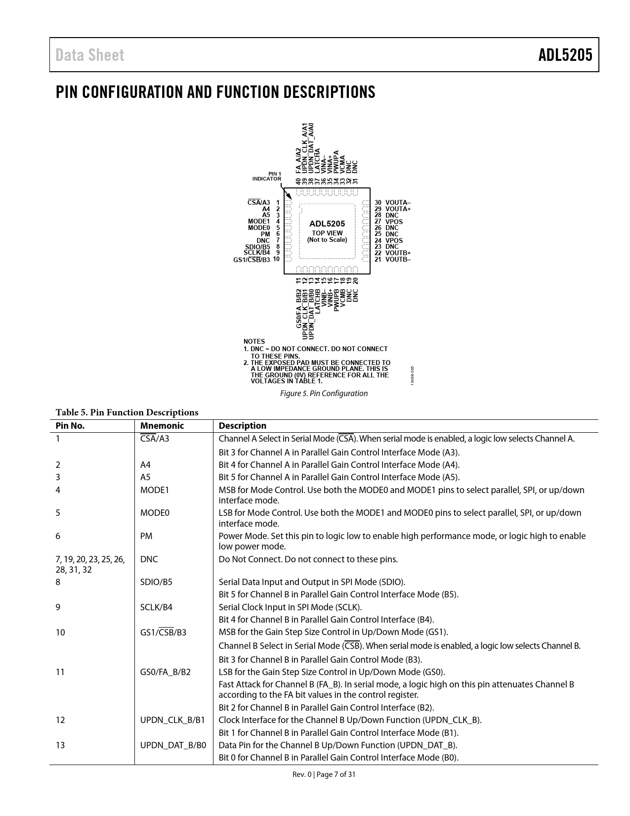 Data SheetADL5205PIN CONFIGURATION AND FUNCTION DESCRIPTIONS1 0A A/ /A A_ _K TL A2 C D AA/ _ _AHPA N NACU_ D D TMCA P P A INA– INA+ W CNF U U L V V P VPIN 1DNC DINDICATOR0 9 8 7 6 5 4 31423 3 3 3 3 3 3 3 3CSA/A3 130 VOUTA–A4 229 VOUTA+A5 328 DNCMODE1 427 VPOSADL5205MODE0 526 DNCPM 6TOP VIEW25 DNCDNC 7(Not to Scale)24 VPOSSDIO/B5 823 DNCSCLK/B4 922 VOUTB+GS1/CSB/B3 1021 VOUTB–11 21 31 4 51 6 71 1 81 91 0122 1 0– +BBB B/ B/ B/ H B B P MBC N N UDNC DNC_ B_ B_CT VI VIVA K TWAFP/ L A L0 C DS _ _G N ND DP PU UNOTES 1. DNC = DO NOT CONNECT. DO NOT CONNECT TO THESE PINS.2. THE EXPOSED PAD MUST BE CONNECTED TOA LOW IMPEDANCE GROUND PLANE. THIS IS 5 THE GROUND (0V) REFERENCE FOR ALL THE -00 VOLTAGES IN TABLE 1. 488 13 Figure 5. Pin Configuration Table 5. Pin Function Descriptions Pin No.MnemonicDescription 1 CSA/A3 Channel A Select in Serial Mode (CSA). When serial mode is enabled, a logic low selects Channel A. Bit 3 for Channel A in Parallel Gain Control Interface Mode (A3). 2 A4 Bit 4 for Channel A in Parallel Gain Control Interface Mode (A4). 3 A5 Bit 5 for Channel A in Parallel Gain Control Interface Mode (A5). 4 MODE1 MSB for Mode Control. Use both the MODE0 and MODE1 pins to select parallel, SPI, or up/down interface mode. 5 MODE0 LSB for Mode Control. Use both the MODE1 and MODE0 pins to select parallel, SPI, or up/down interface mode. 6 PM Power Mode. Set this pin to logic low to enable high performance mode, or logic high to enable low power mode. 7, 19, 20, 23, 25, 26, DNC Do Not Connect. Do not connect to these pins. 28, 31, 32 8 SDIO/B5 Serial Data Input and Output in SPI Mode (SDIO). Bit 5 for Channel B in Parallel Gain Control Interface Mode (B5). 9 SCLK/B4 Serial Clock Input in SPI Mode (SCLK). Bit 4 for Channel B in Parallel Gain Control Interface (B4). 10 GS1/CSB/B3 MSB for the Gain Step Size Control in Up/Down Mode (GS1). Channel B Select in Serial Mode (CSB). When serial mode is enabled, a logic low selects Channel B. Bit 3 for Channel B in Parallel Gain Control Mode (B3). 11 GS0/FA_B/B2 LSB for the Gain Step Size Control in Up/Down Mode (GS0). Fast Attack for Channel B (FA_B). In serial mode, a logic high on this pin attenuates Channel B according to the FA bit values in the control register. Bit 2 for Channel B in Parallel Gain Control Interface (B2). 12 UPDN_CLK_B/B1 Clock Interface for the Channel B Up/Down Function (UPDN_CLK_B). Bit 1 for Channel B in Parallel Gain Control Interface Mode (B1). 13 UPDN_DAT_B/B0 Data Pin for the Channel B Up/Down Function (UPDN_DAT_B). Bit 0 for Channel B in Parallel Gain Control Interface Mode (B0). Rev. 0 | Page 7 of 31 Document Outline FEATURES APPLICATIONS FUNCTIONAL BLOCK DIAGRAM GENERAL DESCRIPTION REVISION HISTORY SPECIFICATIONS TIMING SPECIFICATIONS Timing Diagrams ABSOLUTE MAXIMUM RATINGS THERMAL RESISTANCE JUNCTION TO BOARD THERMAL IMPEDANCE ESD CAUTION PIN CONFIGURATION AND FUNCTION DESCRIPTIONS TYPICAL PERFORMANCE CHARACTERISTICS THEORY OF OPERATION BASIC STRUCTURE CONTROL/LOGIC CIRCUITRY COMMON-MODE VOLTAGE APPLICATIONS INFORMATION BASIC CONNECTIONS DIGITAL INTERFACE OVERVIEW Parallel Digital Interface Serial Peripheral Interface (SPI) Up/Down Interface SPI READ ADC INTERFACING NOISE FIGURE vs. GAIN SETTING EVALUATION BOARD OVERVIEW POWER SUPPLY INTERFACE SIGNAL INPUTS AND OUTPUTS MANUAL CONTROLS Mode Switches Channel Control Switches PARALLEL INTERFACE SERIAL INTERFACE STANDARD DEVELOPMENT PLATFORM (SDP) INTERFACE EVALUATION BOARD CONTROL SOFTWARE COMMAND LINE CONTROL PROGRAM GRAPHICAL USER INTERFACE (GUI) PROGRAM EVALUATION BOARD SCHEMATICS AND LAYOUT BILL OF MATERIALS OUTLINE DIMENSIONS ORDERING GUIDE