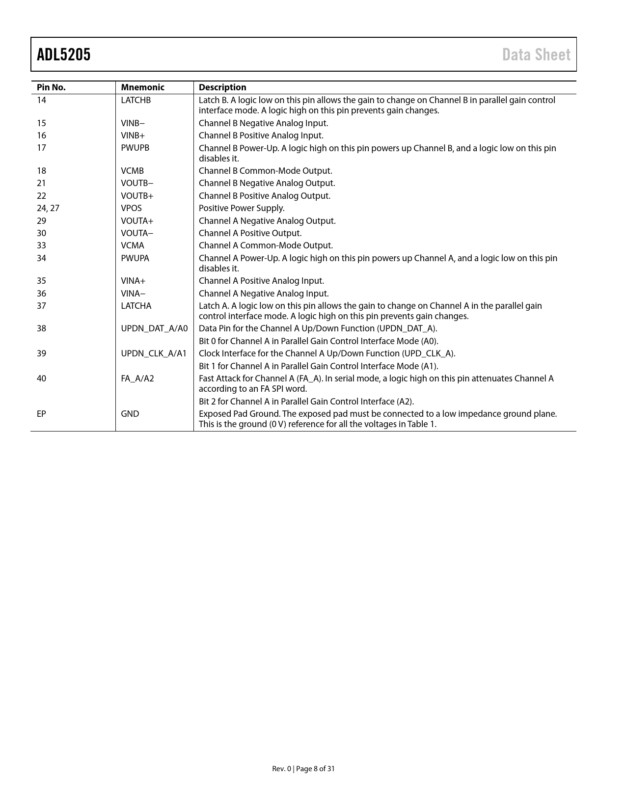 link to page 4 ADL5205Data SheetPin No.MnemonicDescription 14 LATCHB Latch B. A logic low on this pin allows the gain to change on Channel B in parallel gain control interface mode. A logic high on this pin prevents gain changes. 15 VINB− Channel B Negative Analog Input. 16 VINB+ Channel B Positive Analog Input. 17 PWUPB Channel B Power-Up. A logic high on this pin powers up Channel B, and a logic low on this pin disables it. 18 VCMB Channel B Common-Mode Output. 21 VOUTB− Channel B Negative Analog Output. 22 VOUTB+ Channel B Positive Analog Output. 24, 27 VPOS Positive Power Supply. 29 VOUTA+ Channel A Negative Analog Output. 30 VOUTA− Channel A Positive Output. 33 VCMA Channel A Common-Mode Output. 34 PWUPA Channel A Power-Up. A logic high on this pin powers up Channel A, and a logic low on this pin disables it. 35 VINA+ Channel A Positive Analog Input. 36 VINA− Channel A Negative Analog Input. 37 LATCHA Latch A. A logic low on this pin allows the gain to change on Channel A in the parallel gain control interface mode. A logic high on this pin prevents gain changes. 38 UPDN_DAT_A/A0 Data Pin for the Channel A Up/Down Function (UPDN_DAT_A). Bit 0 for Channel A in Parallel Gain Control Interface Mode (A0). 39 UPDN_CLK_A/A1 Clock Interface for the Channel A Up/Down Function (UPD_CLK_A). Bit 1 for Channel A in Parallel Gain Control Interface Mode (A1). 40 FA_A/A2 Fast Attack for Channel A (FA_A). In serial mode, a logic high on this pin attenuates Channel A according to an FA SPI word. Bit 2 for Channel A in Parallel Gain Control Interface (A2). EP GND Exposed Pad Ground. The exposed pad must be connected to a low impedance ground plane. This is the ground (0 V) reference for all the voltages in Table 1. Rev. 0 | Page 8 of 31 Document Outline FEATURES APPLICATIONS FUNCTIONAL BLOCK DIAGRAM GENERAL DESCRIPTION REVISION HISTORY SPECIFICATIONS TIMING SPECIFICATIONS Timing Diagrams ABSOLUTE MAXIMUM RATINGS THERMAL RESISTANCE JUNCTION TO BOARD THERMAL IMPEDANCE ESD CAUTION PIN CONFIGURATION AND FUNCTION DESCRIPTIONS TYPICAL PERFORMANCE CHARACTERISTICS THEORY OF OPERATION BASIC STRUCTURE CONTROL/LOGIC CIRCUITRY COMMON-MODE VOLTAGE APPLICATIONS INFORMATION BASIC CONNECTIONS DIGITAL INTERFACE OVERVIEW Parallel Digital Interface Serial Peripheral Interface (SPI) Up/Down Interface SPI READ ADC INTERFACING NOISE FIGURE vs. GAIN SETTING EVALUATION BOARD OVERVIEW POWER SUPPLY INTERFACE SIGNAL INPUTS AND OUTPUTS MANUAL CONTROLS Mode Switches Channel Control Switches PARALLEL INTERFACE SERIAL INTERFACE STANDARD DEVELOPMENT PLATFORM (SDP) INTERFACE EVALUATION BOARD CONTROL SOFTWARE COMMAND LINE CONTROL PROGRAM GRAPHICAL USER INTERFACE (GUI) PROGRAM EVALUATION BOARD SCHEMATICS AND LAYOUT BILL OF MATERIALS OUTLINE DIMENSIONS ORDERING GUIDE