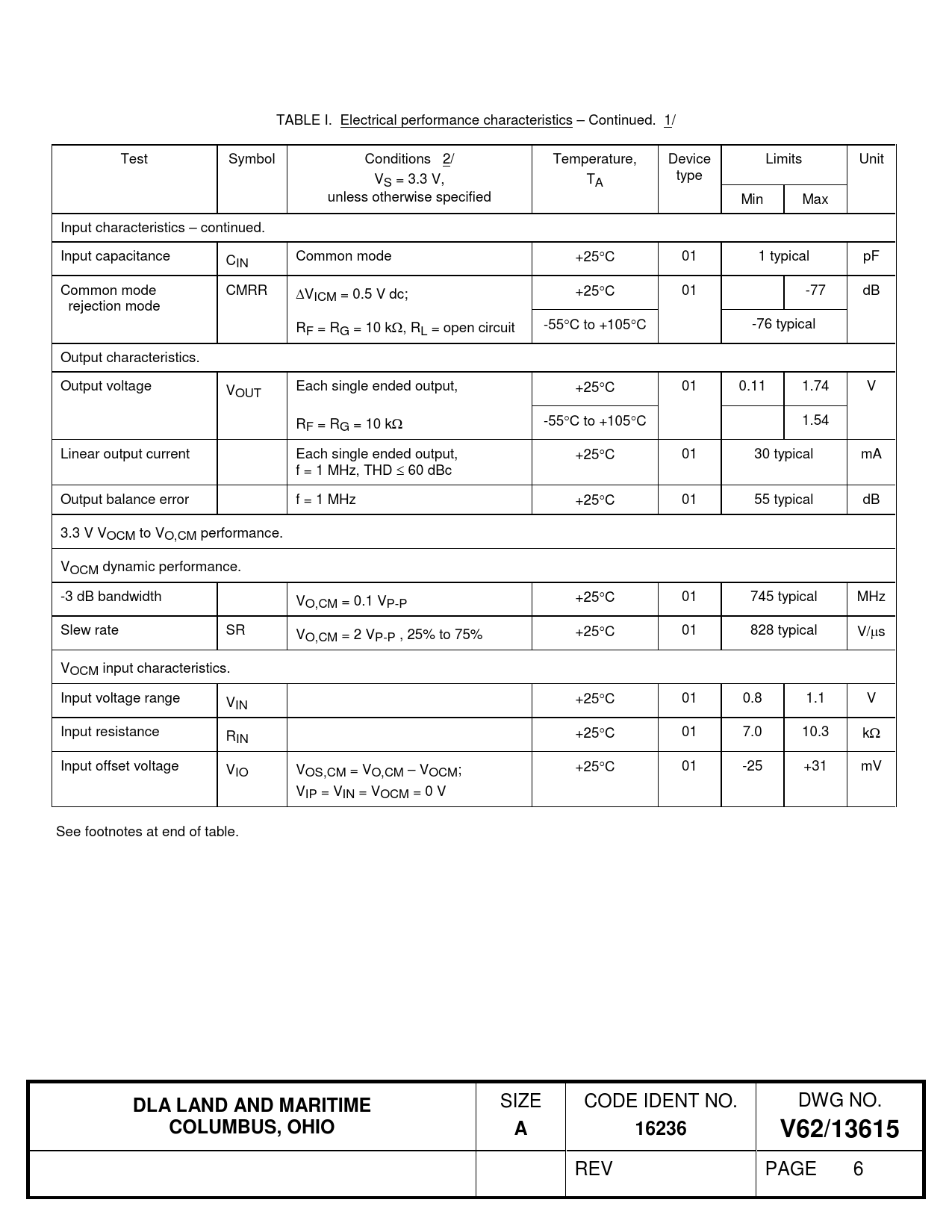 TABLE I. Electrical performance characteristics – Continued. 1/ Test Symbol Conditions 2/ Temperature, Device Limits Unit V type S = 3.3 V, TA unless otherwise specified Min Max Input characteristics – continued. Input capacitance CIN Common mode +25°C 01 1 typical pF Common mode CMRR ∆VICM = 0.5 V dc; +25°C 01 -77 dB rejection mode RF = RG = 10 kΩ, RL = open circuit -55°C to +105°C -76 typical Output characteristics. Output voltage VOUT Each single ended output, +25°C 01 0.11 1.74 V RF = RG = 10 kΩ -55°C to +105°C 1.54 Linear output current Each single ended output, +25°C 01 30 typical mA f = 1 MHz, THD ≤ 60 dBc Output balance error f = 1 MHz +25°C 01 55 typical dB 3.3 V VOCM to VO,CM performance. VOCM dynamic performance. -3 dB bandwidth VO,CM = 0.1 VP-P +25°C 01 745 typical MHz Slew rate SR VO,CM = 2 VP-P , 25% to 75% +25°C 01 828 typical V/µs VOCM input characteristics. Input voltage range VIN +25°C 01 0.8 1.1 V Input resistance RIN +25°C 01 7.0 10.3 kΩ Input offset voltage V +25°C 01 -25 +31 mV IO VOS,CM = VO,CM – VOCM; VIP = VIN = VOCM = 0 V See footnotes at end of table.