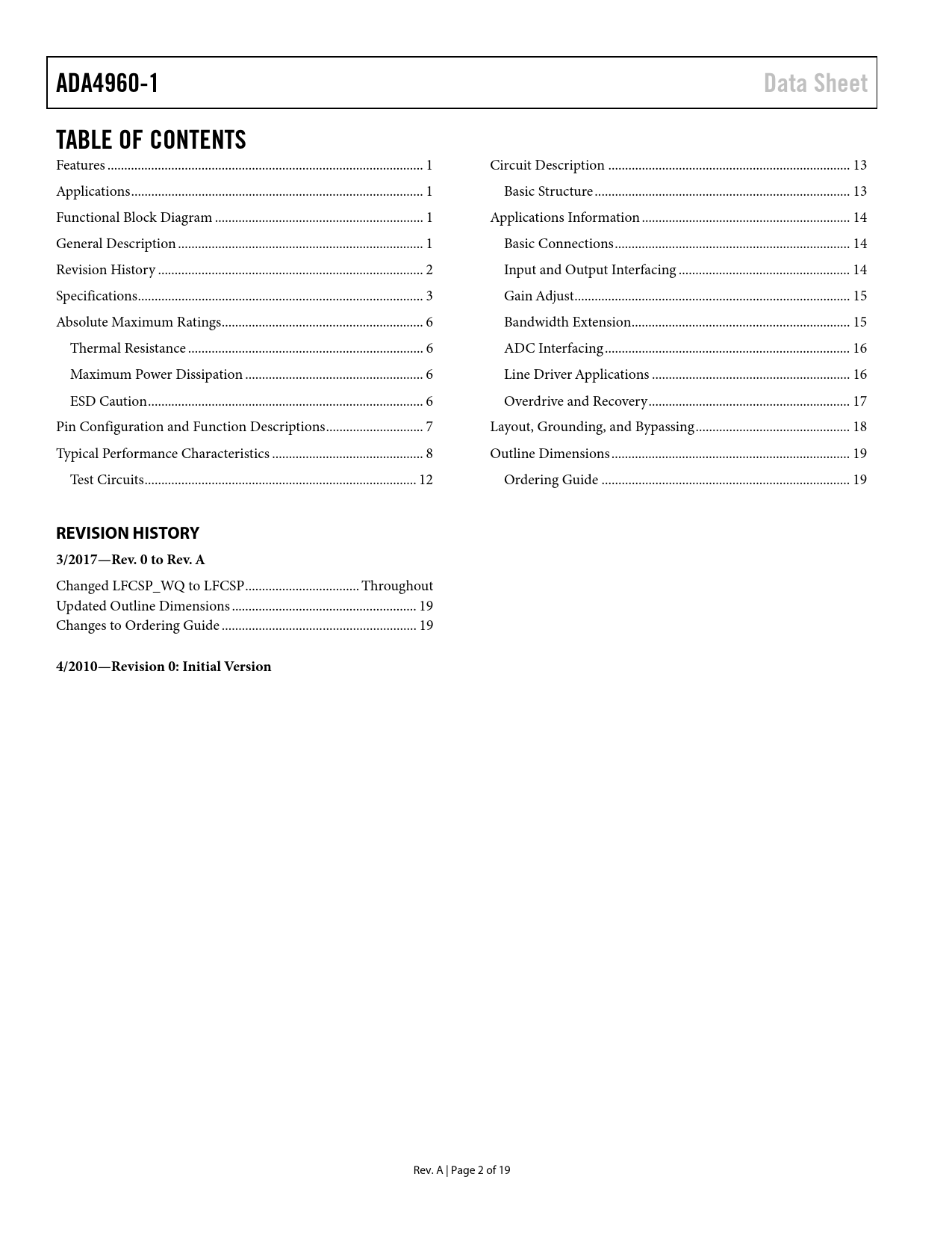 link to page 1 link to page 1 link to page 1 link to page 4 link to page 5 link to page 8 link to page 8 link to page 8 link to page 8 link to page 9 link to page 10 link to page 14 link to page 15 link to page 15 link to page 16 link to page 16 link to page 16 link to page 17 link to page 17 link to page 18 link to page 18 link to page 19 link to page 20 link to page 21 link to page 21 ADA4960-1Data SheetTABLE OF CONTENTS Features .. 1 Circuit Description .. 13 Applications ... 1 Basic Structure .. 13 Functional Block Diagram .. 1 Applications Information .. 14 General Description ... 1 Basic Connections .. 14 Revision History ... 2 Input and Output Interfacing ... 14 Specifications ... 3 Gain Adjust .. 15 Absolute Maximum Ratings .. 6 Bandwidth Extension ... 15 Thermal Resistance .. 6 ADC Interfacing ... 16 Maximum Power Dissipation ... 6 Line Driver Applications ... 16 ESD Caution .. 6 Overdrive and Recovery .. 17 Pin Configuration and Function Descriptions ... 7 Layout, Grounding, and Bypassing .. 18 Typical Performance Characteristics ... 8 Outline Dimensions ... 19 Test Circuits ... 12 Ordering Guide .. 19 REVISION HISTORY3/2017—Rev. 0 to Rev. A Changed LFCSP_WQ to LFCSP .. Throughout Updated Outline Dimensions ... 19 Changes to Ordering Guide .. 19 4/2010—Revision 0: Initial Version Rev. A | Page 2 of 19 Document Outline Features Applications Functional Block Diagram General Description Revision History Specifications Absolute Maximum Ratings Thermal Resistance Maximum Power Dissipation ESD Caution Pin Configuration and Function Descriptions Typical Performance Characteristics Test Circuits Circuit Description Basic Structure Applications Information Basic Connections Input and Output Interfacing Gain Adjust Bandwidth Extension ADC Interfacing Line Driver Applications Overdrive and Recovery Layout, Grounding, and Bypassing Outline Dimensions Ordering Guide