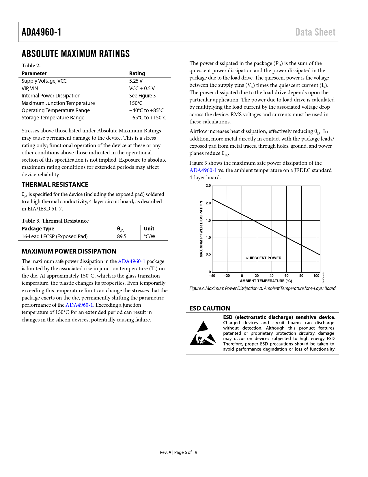 link to page 8 link to page 8 ADA4960-1Data SheetABSOLUTE MAXIMUM RATINGS Table 2. The power dissipated in the package (PD) is the sum of the ParameterRating quiescent power dissipation and the power dissipated in the package due to the load drive. The quiescent power is the voltage Supply Voltage, VCC 5.25 V between the supply pins (V VIP, VIN VCC + 0.5 V S) times the quiescent current (IS). The power dissipated due to the load drive depends upon the Internal Power Dissipation See Figure 3 particular application. The power due to load drive is calculated Maximum Junction Temperature 150°C by multiplying the load current by the associated voltage drop Operating Temperature Range −40°C to +85°C across the device. RMS voltages and currents must be used in Storage Temperature Range −65°C to +150°C these calculations. Stresses above those listed under Absolute Maximum Ratings Airflow increases heat dissipation, effectively reducing θJA. In may cause permanent damage to the device. This is a stress addition, more metal directly in contact with the package leads/ rating only; functional operation of the device at these or any exposed pad from metal traces, through holes, ground, and power other conditions above those indicated in the operational planes reduce θJA. section of this specification is not implied. Exposure to absolute Figure 3 shows the maximum safe power dissipation of the maximum rating conditions for extended periods may affect ADA4960-1 vs. the ambient temperature on a JEDEC standard device reliability. 4-layer board. THERMAL RESISTANCE2.5 θJA is specified for the device (including the exposed pad) soldered to a high thermal conductivity, 4-layer circuit board, as described N2.0 in EIA/JESD 51-7. IO T PATable 3. Thermal ResistanceISSI1.5DPackage TypeθUnitJAER W 16-Lead LFCSP (Exposed Pad) 89.5 °C/W 1.0M POMUMAXIMUM POWER DISSIPATIONXI0.5MA The maximum safe power dissipation in the ADA4960-1 package QUIESCENT POWER is limited by the associated rise in junction temperature (TJ) on 0 the die. At approximately 150°C, which is the glass transition –40–20020406080100 002 temperature, the plastic changes its properties. Even temporarily AMBIENT TEMPERATURE (°C) 08458- exceeding this temperature limit can change the stresses that the Figure 3. Maximum Power Dissipation vs. Ambient Temperature for 4-Layer Board package exerts on the die, permanently shifting the parametric performance of the ADA4960-1. Exceeding a junction ESD CAUTION temperature of 150°C for an extended period can result in changes in the silicon devices, potentially causing failure. Rev. A | Page 6 of 19 Document Outline Features Applications Functional Block Diagram General Description Revision History Specifications Absolute Maximum Ratings Thermal Resistance Maximum Power Dissipation ESD Caution Pin Configuration and Function Descriptions Typical Performance Characteristics Test Circuits Circuit Description Basic Structure Applications Information Basic Connections Input and Output Interfacing Gain Adjust Bandwidth Extension ADC Interfacing Line Driver Applications Overdrive and Recovery Layout, Grounding, and Bypassing Outline Dimensions Ordering Guide