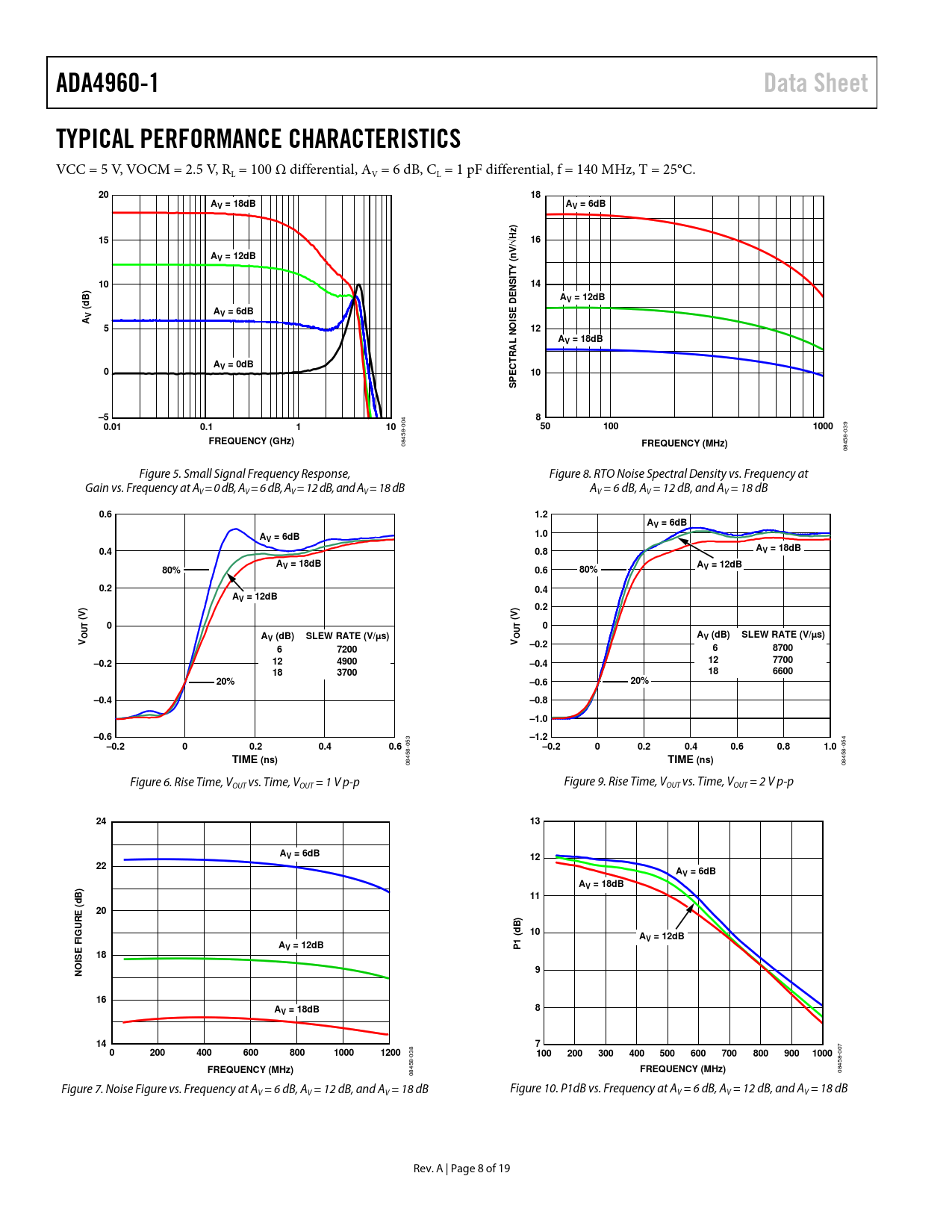 ADA4960-1Data SheetTYPICAL PERFORMANCE CHARACTERISTICS VCC = 5 V, VOCM = 2.5 V, RL = 100 Ω differential, AV = 6 dB, CL = 1 pF differential, f = 140 MHz, T = 25°C. 2018AV = 18dBAV = 6dB)1516√Hz V/AV = 12dB(n Y T10SI14B)ENAdV = 12dB( VAV = 6dBAISE D5O12N LAV = 18dBA RATV = 0dB010SPEC–580.010.1110 004 501001000 039 FREQUENCY (GHz) 08458- FREQUENCY (MHz) 08458- Figure 5. Small Signal Frequency Response, Figure 8. RTO Noise Spectral Density vs. Frequency at Gain vs. Frequency at AV = 0 dB, AV = 6 dB, AV = 12 dB, and AV = 18 dB AV = 6 dB, AV = 12 dB, and AV = 18 dB 0.61.2AV = 6dBA1.0V = 6dB0.40.8AV = 18dBAV = 18dBA80%0.6V = 12dB80%0.20.4AV = 12dB0.2(V)(V)00UTUTOAOAV (dB)SLEW RATE (V/µs)VV (dB)SLEW RATE (V/µs)V–0.26720068700–0.2124900–0.412770018370018660020%–0.620%–0.4–0.8–1.0–0.6–1.2–0.200.20.40.6 053 –0.200.20.40.60.81.0 054 TIME (ns)TIME (ns) 08458- 08458- Figure 6. Rise Time, V Figure 9. Rise Time, V OUT vs. Time, VOUT = 1 V p-p OUT vs. Time, VOUT = 2 V p-p 2413AV = 6dB1222AV = 6dB)AV = 18dB11dB (20E RB) d10AV = 12dBFIGU1 (AEV = 12dBP18OIS N916A8V = 18dB147020040060080010001200 007 038 1002003004005006007008009001000FREQUENCY (MHz)FREQUENCY (MHz) 08458- 08458- Figure 7. Noise Figure vs. Frequency at A Figure 10. P1dB vs. Frequency at A V = 6 dB, AV = 12 dB, and AV = 18 dB V = 6 dB, AV = 12 dB, and AV = 18 dB Rev. A | Page 8 of 19 Document Outline Features Applications Functional Block Diagram General Description Revision History Specifications Absolute Maximum Ratings Thermal Resistance Maximum Power Dissipation ESD Caution Pin Configuration and Function Descriptions Typical Performance Characteristics Test Circuits Circuit Description Basic Structure Applications Information Basic Connections Input and Output Interfacing Gain Adjust Bandwidth Extension ADC Interfacing Line Driver Applications Overdrive and Recovery Layout, Grounding, and Bypassing Outline Dimensions Ordering Guide