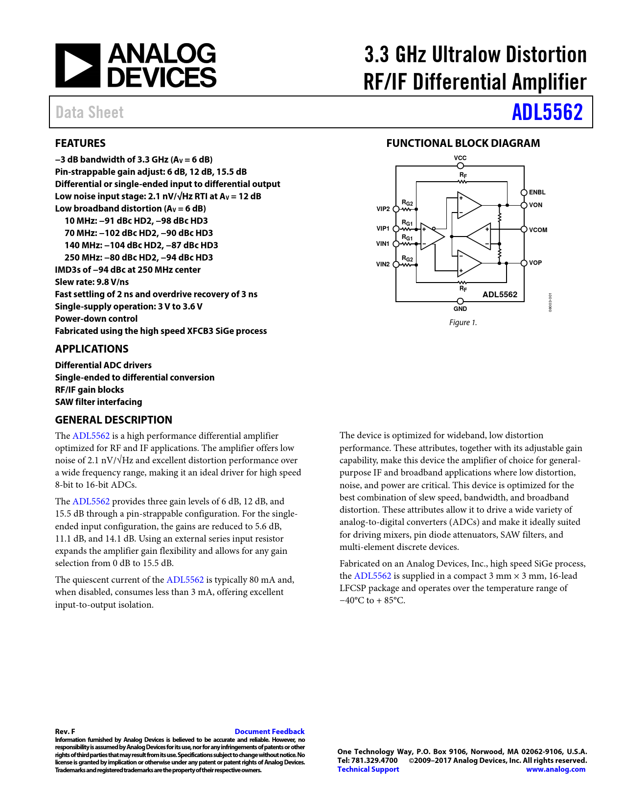 3.3 GHz Ultralow Distortion. RF/IF Differential Amplifier. Data Sheet. ADL5562. FEATURES. FUNCTIONAL BLOCK DIAGRAM