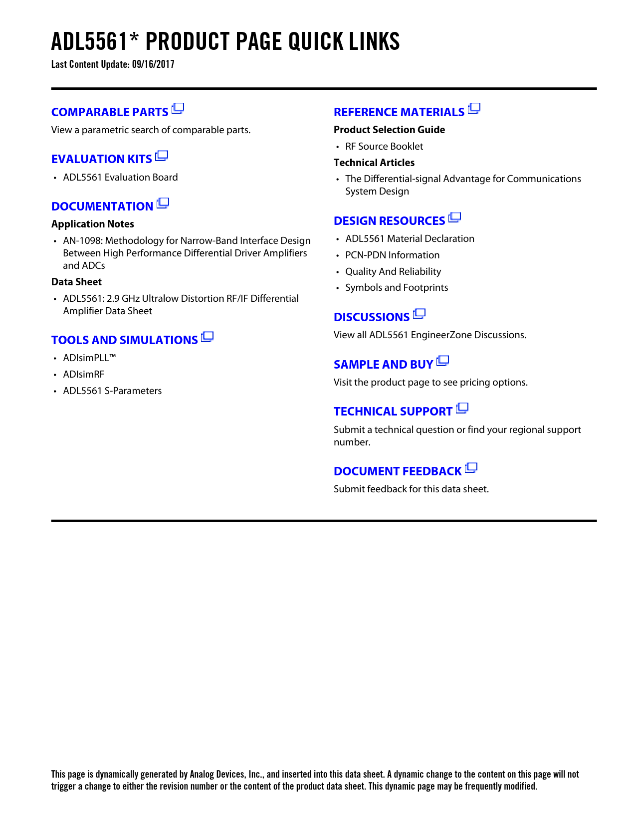 ADL5561* PRODUCT PAGE QUICK LINKS Last Content Update: 09/16/2017. COMPARABLE PARTS. REFERENCE MATERIALS
