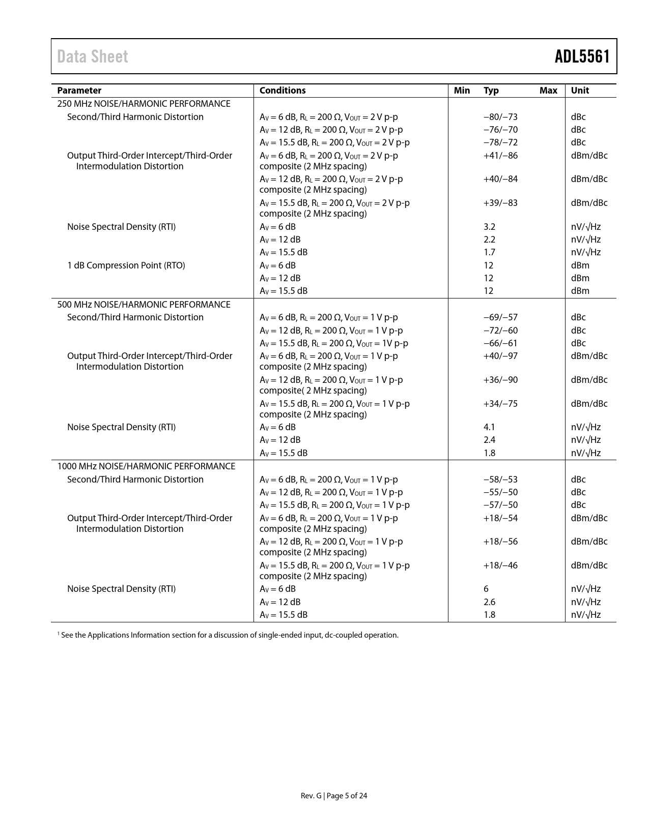 250 MHz NOISE/HARMONIC PERFORMANCE Second/Third Harmonic Distortion AV = 6 dB, RL = 200 Ω, VOUT = 2 V p-p −80/−73 dBc AV = 12 dB, RL = 200 Ω, VOUT = 2 V p-p −76/−70 dBc AV = 15.5 dB, RL = 200 Ω, VOUT = 2 V p-p −78/−72 dBc Output Third-Order Intercept/Third-Order AV = 6 dB, RL = 200 Ω, VOUT = 2 V p-p +41/−86 dBm/dBc Intermodulation Distortion composite (2 MHz spacing) AV = 12 dB, RL = 200 Ω, VOUT = 2 V p-p +40/−84 dBm/dBc composite (2 MHz spacing) AV = 15.5 dB, RL = 200 Ω, VOUT = 2 V p-p +39/−83 dBm/dBc composite (2 MHz spacing) Noise Spectral Density (RTI) AV = 6 dB 3.2 nV/√Hz AV = 12 dB 2.2 nV/√Hz AV = 15.5 dB 1.7 nV/√Hz 1 dB Compression Point (RTO) AV = 6 dB 12 dBm AV = 12 dB 12 dBm AV = 15.5 dB 12 dBm 500 MHz NOISE/HARMONIC PERFORMANCE Second/Third Harmonic Distortion AV = 6 dB, RL = 200 Ω, VOUT = 1 V p-p −69/−57 dBc AV = 12 dB, RL = 200 Ω, VOUT = 1 V p-p −72/−60 dBc AV = 15.5 dB, RL = 200 Ω, VOUT = 1V p-p −66/−61 dBc Output Third-Order Intercept/Third-Order AV = 6 dB, RL = 200 Ω, VOUT = 1 V p-p +40/−97 dBm/dBc Intermodulation Distortion composite (2 MHz spacing) AV = 12 dB, RL = 200 Ω, VOUT = 1 V p-p +36/−90 dBm/dBc composite( 2 MHz spacing) AV = 15.5 dB, RL = 200 Ω, VOUT = 1 V p-p +34/−75 dBm/dBc composite (2 MHz spacing) Noise Spectral Density (RTI) AV = 6 dB 4.1 nV/√Hz AV = 12 dB 2.4 nV/√Hz AV = 15.5 dB 1.8 nV/√Hz 1000 MHz NOISE/HARMONIC PERFORMANCE Second/Third Harmonic Distortion AV = 6 dB, RL = 200 Ω, VOUT = 1 V p-p −58/−53 dBc AV = 12 dB, RL = 200 Ω, VOUT = 1 V p-p −55/−50 dBc AV = 15.5 dB, RL = 200 Ω, VOUT = 1 V p-p −57/−50 dBc Output Third-Order Intercept/Third-Order AV = 6 dB, RL = 200 Ω, VOUT = 1 V p-p +18/−54 dBm/dBc Intermodulation Distortion composite (2 MHz spacing) AV = 12 dB, RL = 200 Ω, VOUT = 1 V p-p +18/−56 dBm/dBc composite (2 MHz spacing) AV = 15.5 dB, RL = 200 Ω, VOUT = 1 V p-p +18/−46 dBm/dBc composite (2 MHz spacing) Noise Spectral Density (RTI) AV = 6 dB 6 nV/√Hz AV = 12 dB 2.6 nV/√Hz AV = 15.5 dB 1.8 nV/√Hz 1 See the Applications Information section for a discussion of single-ended input, dc-coupled operation. Rev. G | Page 5 of 24 Document Outline FEATURES APPLICATIONS FUNCTIONAL BLOCK DIAGRAM GENERAL DESCRIPTION REVISION HISTORY SPECIFICATIONS ABSOLUTE MAXIMUM RATINGS ESD CAUTION PIN CONFIGURATION AND FUNCTION DESCRIPTIONS TYPICAL PERFORMANCE CHARACTERISTICS CIRCUIT DESCRIPTION BASIC STRUCTURE APPLICATIONS INFORMATION BASIC CONNECTIONS INPUT AND OUTPUT INTERFACING Single-Ended Input to Differential Output GAIN ADJUSTMENT AND INTERFACING ADC INTERFACING LAYOUT CONSIDERATIONS SOLDERING INFORMATION EVALUATION BOARD OUTLINE DIMENSIONS ORDERING GUIDE