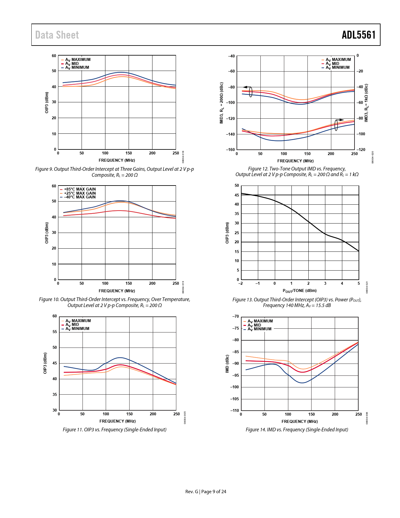 Data Sheet. ADL5561. –40. AV MAXIMUM. AV MID. AV MINIMUM. –60. –20. –80. c) B. –100. 3 (. = 1. = 20. OIP. 3, R. D –120. D IM. –140. –160. –120. 100. 150. 200. 250