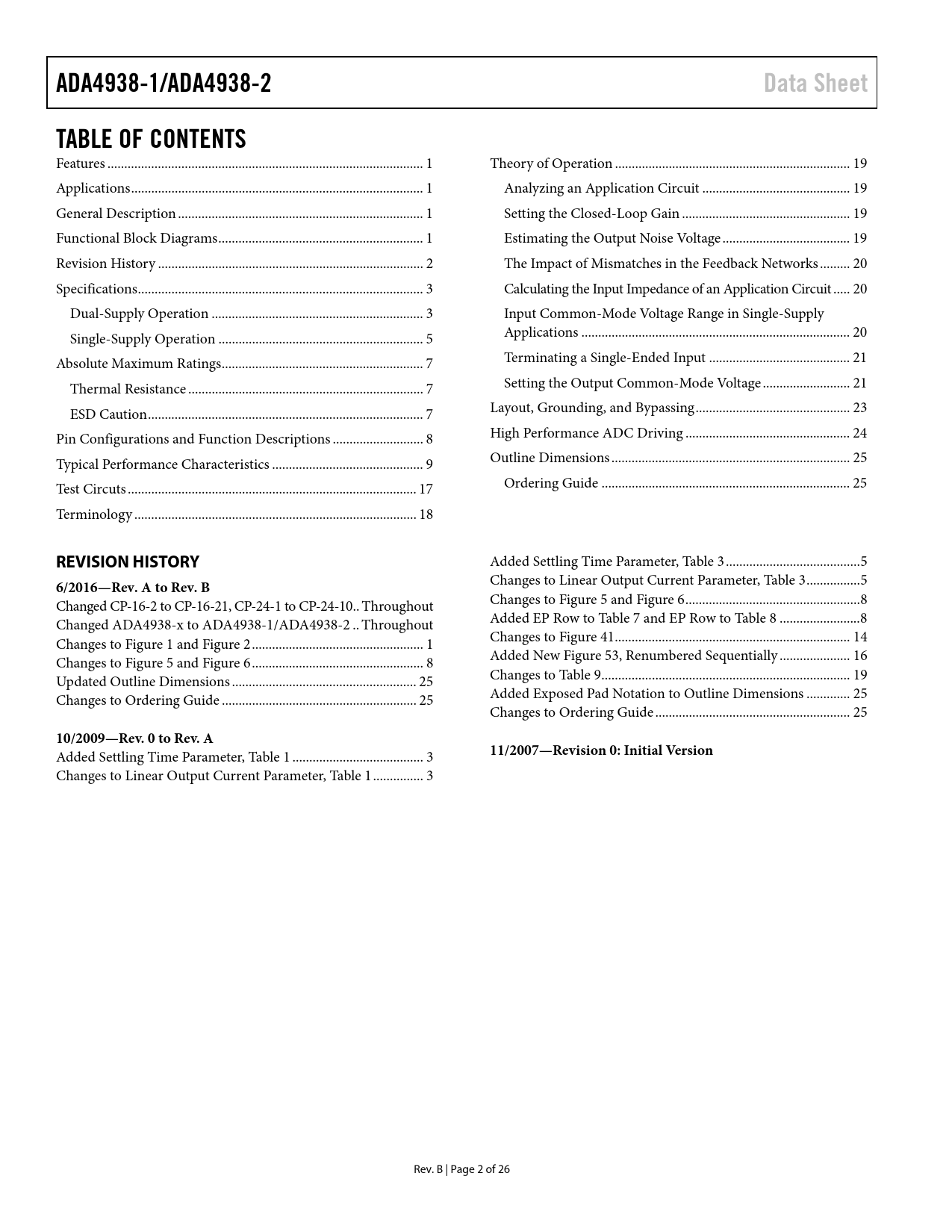 ADA4938-1/ADA4938-2. Data Sheet. TABLE OF CONTENTS. REVISION HISTORY. 6/2016—Rev. A to Rev. B. 10/2009—Rev. 0 to Rev. A