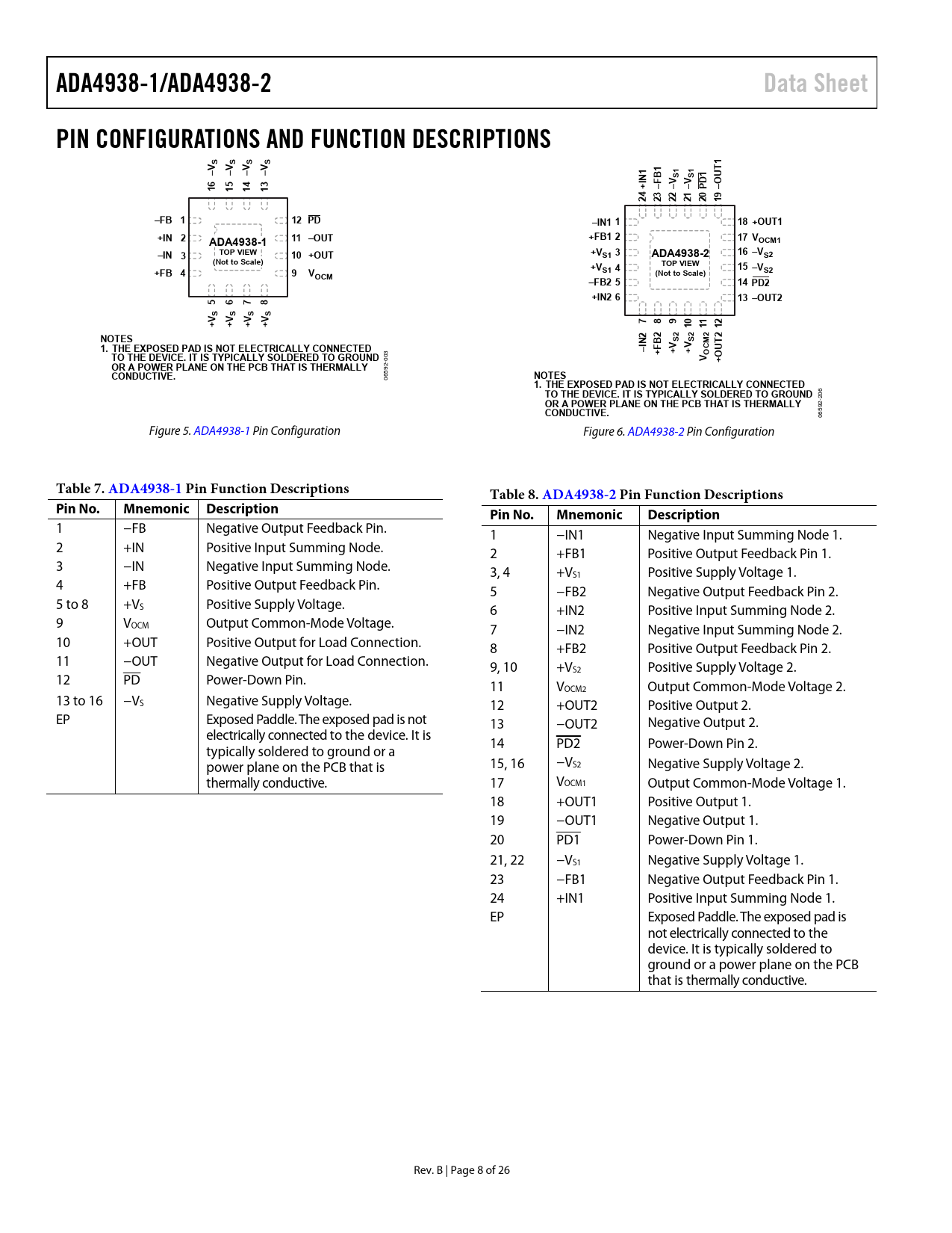 0 Figure 5. ADA4938-1 Pin Configuration Figure 6. ADA4938-2 Pin Configuration