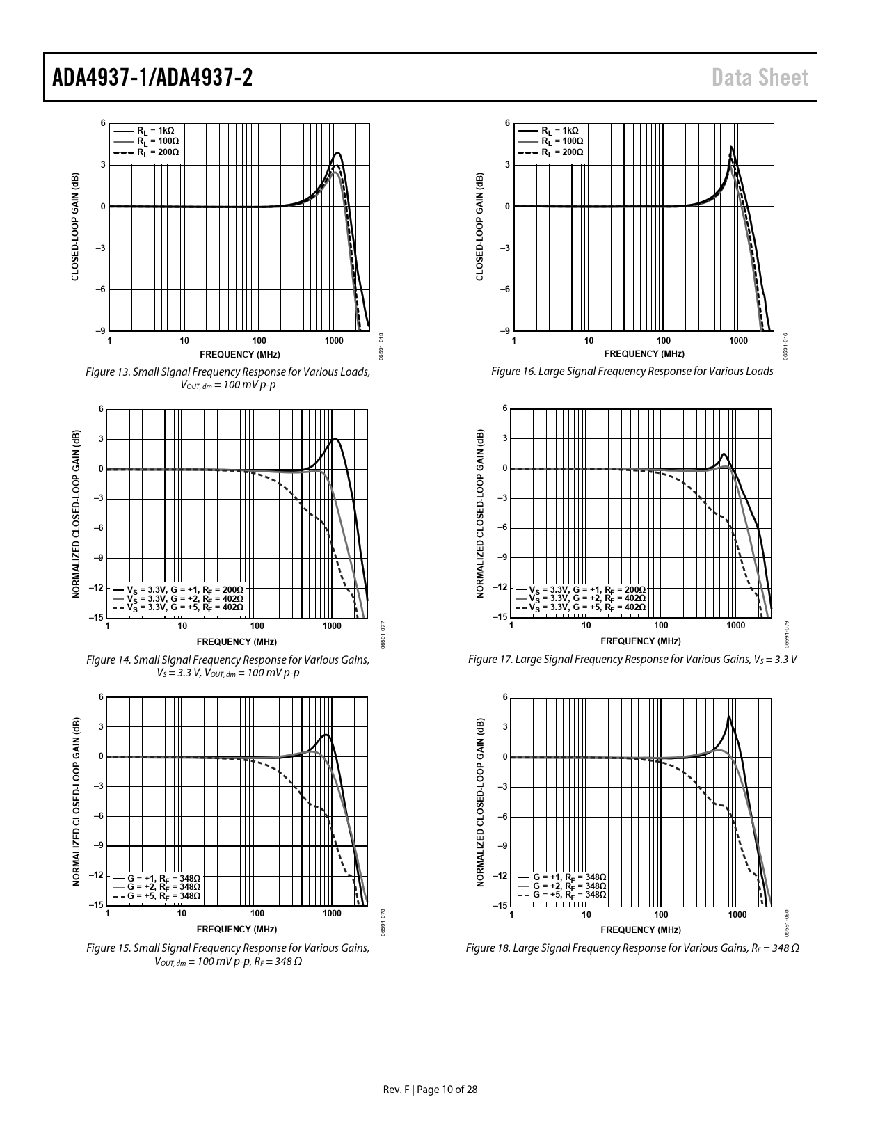 ADA4937-1/ADA4937-2Data Sheet66RL = 1kΩRL = 1kΩRL = 100ΩRL = 100ΩRL = 200ΩRL = 200Ω33))BBdd((ININ00GAGAPPOOOO-L-LD–3D–3EEOSOSLLCC–6–6–9–91101001000 13 16 0 1101001000 0 1- 1- FREQUENCY (MHz) 59 FREQUENCY (MHz) 59 06 06 Figure 13. Small Signal Frequency Response for Various Loads, Figure 16. Large Signal Frequency Response for Various Loads VOUT, dm = 100 mV p-p 66B)3B)d3dN (N (AIAI0G0GPPOOOOL–3L–3D-D-EESSOOL–6–6D CD CLEEIZ–9IZ–9LALARMRM–12V–12VNOS = 3.3V, G = +1, RF = 200ΩS = 3.3V, G = +1, RF = 200ΩVNOS = 3.3V, G = +2, RF = 402ΩVS = 3.3V, G = +2, RF = 402ΩVS = 3.3V, G = +5, RF = 402ΩVS = 3.3V, G = +5, RF = 402Ω–15–151101001000 77 1101001000 79 0 0 1- 1- 59 FREQUENCY (MHz) 59 FREQUENCY (MHz) 06 06 Figure 14. Small Signal Frequency Response for Various Gains, Figure 17. Large Signal Frequency Response for Various Gains, VS = 3.3 V VS = 3.3 V, VOUT, dm = 100 mV p-p 66B)3dB)3((dININAA0G0GPPOOO LO–3-L–3D-DEESSO–6O–6CL DD CLEEIZ–9IZ–9ALALRM–12RM–12G = +1, RNOG = +1, RF = 348ΩF = 348ΩG = +2, RNOF = 348ΩG = +2, RF = 348ΩG = +5, RF = 348ΩG = +5, RF = 348Ω–15–151101001000 8 0 07 1101001000 1- -08 59 FREQUENCY (MHz) 91 FREQUENCY (MHz) 06 65 0 Figure 15. Small Signal Frequency Response for Various Gains, Figure 18. Large Signal Frequency Response for Various Gains, RF = 348 Ω VOUT, dm = 100 mV p-p, RF = 348 Ω Rev. F | Page 10 of 28 Document Outline FEATURES APPLICATIONS GENERAL DESCRIPTION FUNCTIONAL BLOCK DIAGRAMS REVISION HISTORY SPECIFICATIONS 5 V OPERATION ±DIN to ±OUT Performance VOCM to ±OUT Performance 3.3 V OPERATION ±DIN to ±OUT Performance VOCM to ±OUT Performance ABSOLUTE MAXIMUM RATINGS THERMAL RESISTANCE Maximum Power Dissipation ESD CAUTION PIN CONFIGURATIONS AND FUNCTION DESCRIPTIONS TYPICAL PERFORMANCE CHARACTERISTICS TEST CIRCUITS TERMINOLOGY THEORY OF OPERATION ANALYZING AN APPLICATION CIRCUIT SETTING THE CLOSED-LOOP GAIN ESTIMATING THE OUTPUT NOISE VOLTAGE IMPACT OF MISMATCHES IN THE FEEDBACK NETWORKS CALCULATING THE INPUT IMPEDANCE FOR AN APPLICATION CIRCUIT Terminating a Single-Ended Input INPUT COMMON-MODE VOLTAGE RANGE IN SINGLE-SUPPLY APPLICATIONS SETTING THE OUTPUT COMMON-MODE VOLTAGE POWER-DOWN OPERATION LAYOUT, GROUNDING, AND BYPASSING HIGH PERFORMANCE ADC DRIVING 3.3 V OPERATION OUTLINE DIMENSIONS ORDERING GUIDE