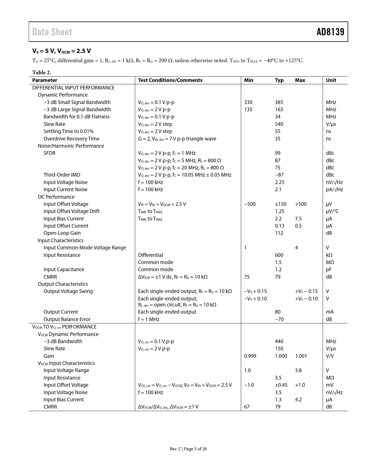 Data SheetAD8139VS = 5 V, VOCM = 2.5 V TA = 25°C, differential gain = 1, RL, dm = 1 kΩ, RF = RG = 200 Ω, unless otherwise noted. TMIN to TMAX = −40°C to +125°C. Table 2. ParameterTest Conditions/CommentsMinTypMaxUnit DIFFERENTIAL INPUT PERFORMANCE Dynamic Performance −3 dB Small Signal Bandwidth VO, dm = 0.1 V p-p 330 385 MHz −3 dB Large Signal Bandwidth VO, dm = 2 V p-p 135 165 MHz Bandwidth for 0.1 dB Flatness VO, dm = 0.1 V p-p 34 MHz Slew Rate VO, dm = 2 V step 540 V/µs Settling Time to 0.01% VO, dm = 2 V step 55 ns Overdrive Recovery Time G = 2, VIN, dm = 7 V p-p triangle wave 35 ns Noise/Harmonic Performance SFDR VO, dm = 2 V p-p, fC = 1 MHz 99 dBc VO, dm = 2 V p-p, fC = 5 MHz, RL = 800 Ω 87 dBc VO, dm = 2 V p-p, fC = 20 MHz, RL = 800 Ω 75 dBc Third-Order IMD VO, dm = 2 V p-p, fC = 10.05 MHz ± 0.05 MHz −87 dBc Input Voltage Noise f = 100 kHz 2.25 nV/√Hz Input Current Noise f = 100 kHz 2.1 pA/√Hz DC Performance Input Offset Voltage VIP = VIN = VOCM = 2.5 V −500 ±150 +500 µV Input Offset Voltage Drift TMIN to TMAX 1.25 µV/°C Input Bias Current TMIN to TMAX 2.2 7.5 µA Input Offset Current 0.13 0.5 µA Open-Loop Gain 112 dB Input Characteristics Input Common-Mode Voltage Range 1 4 V Input Resistance Differential 600 kΩ Common mode 1.5 MΩ Input Capacitance Common mode 1.2 pF CMRR ΔVICM = ±1 V dc, RF = RG = 10 kΩ 75 79 dB Output Characteristics Output Voltage Swing Each single-ended output, RF = RG = 10 kΩ −VS + 0.15 +VS − 0.15 V Each single-ended output, −VS + 0.10 +VS − 0.10 V RL, dm = open circuit, RF = RG = 10 kΩ Output Current Each single-ended output 80 mA Output Balance Error f = 1 MHz −70 dB VOCM TO VO, cm PERFORMANCE VOCM Dynamic Performance −3 dB Bandwidth VO, cm = 0.1 V p-p 440 MHz Slew Rate VO, cm = 2 V p-p 150 V/µs Gain 0.999 1.000 1.001 V/V VOCM Input Characteristics Input Voltage Range 1.0 3.8 V Input Resistance 3.5 MΩ Input Offset Voltage VOS, cm = VO, cm − VOCM; VIP = VIN = VOCM = 2.5 V −1.0 ±0.45 +1.0 mV Input Voltage Noise f = 100 kHz 3.5 nV/√Hz Input Bias Current 1.3 4.2 µA CMRR ΔVOCM/ΔVO, dm, ΔVOCM = ±1 V 67 79 dB Rev. C | Page 5 of 26 Document Outline FEATURES APPLICATIONS GENERAL DESCRIPTION FUNCTIONAL BLOCK DIAGRAMS TABLE OF CONTENTS REVISION HISTORY SPECIFICATIONS VS = ±5 V, VOCM = 0 V VS = 5 V, VOCM = 2.5 V ABSOLUTE MAXIMUM RATINGS THERMAL RESISTANCE Maximum Power Dissipation ESD CAUTION PIN CONFIGURATIONS AND FUNCTION DESCRIPTIONS TYPICAL PERFORMANCE CHARACTERISTICS TEST CIRCUITS THEORY OF OPERATION TYPICAL CONNECTION AND DEFINITION OF TERMS Output Balance APPLICATIONS INFORMATION ESTIMATING NOISE, GAIN, AND BANDWIDTH WITH MATCHED FEEDBACK NETWORKS Estimating Output Noise Voltage Voltage Gain Feedback Factor Notation Input Common-Mode Voltage Calculating Input Impedance Input Common-Mode Swing Considerations Bandwidth vs. Closed-Loop Gain Estimating DC Errors Other Impact of Mismatches in the Feedback Networks Driving a Capacitive Load Layout Considerations Terminating a Single-Ended Input Exposed Paddle (EP) OUTLINE DIMENSIONS ORDERING GUIDE