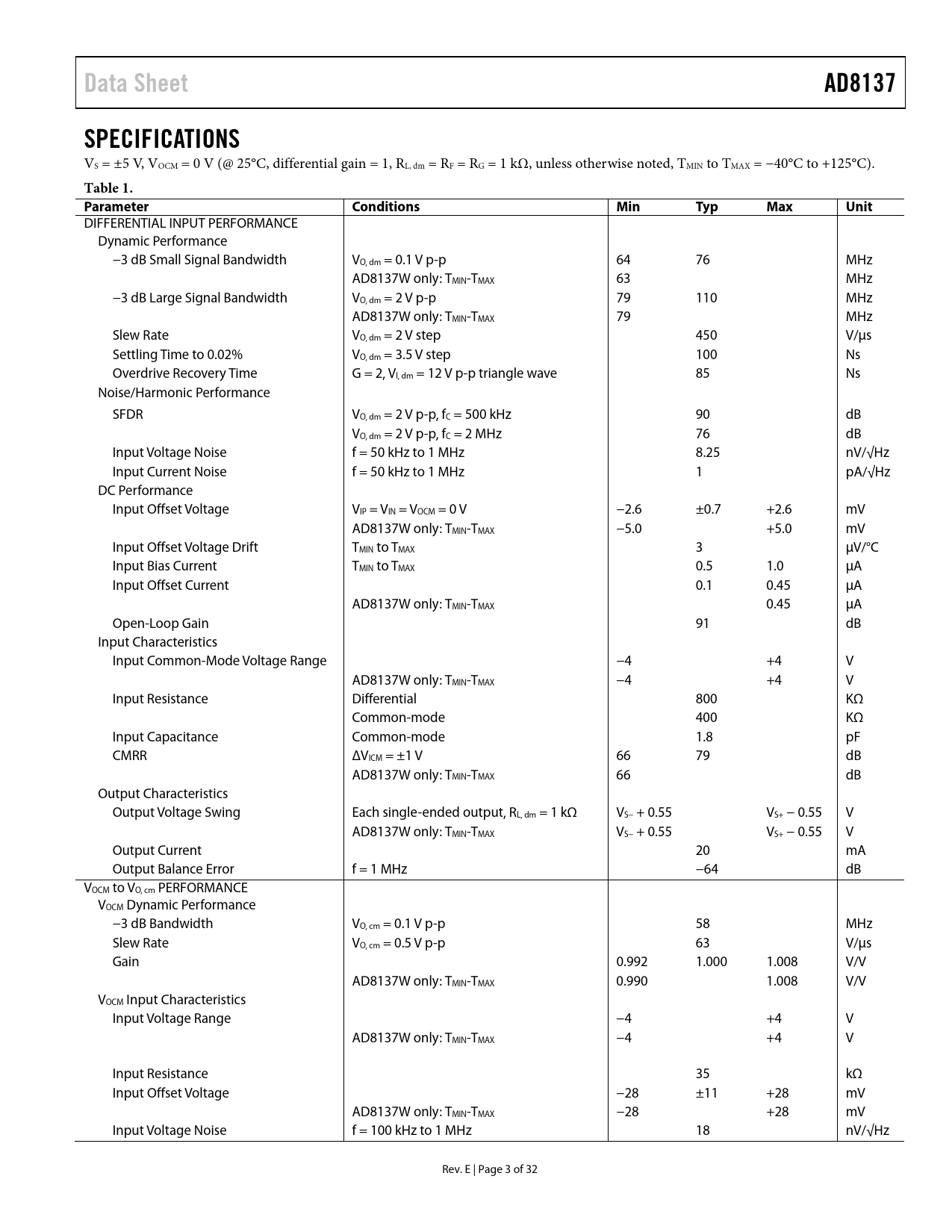 Data Sheet AD8137 SPECIFICATIONS Table 1 Parameter Conditions Min Typ Max Unit