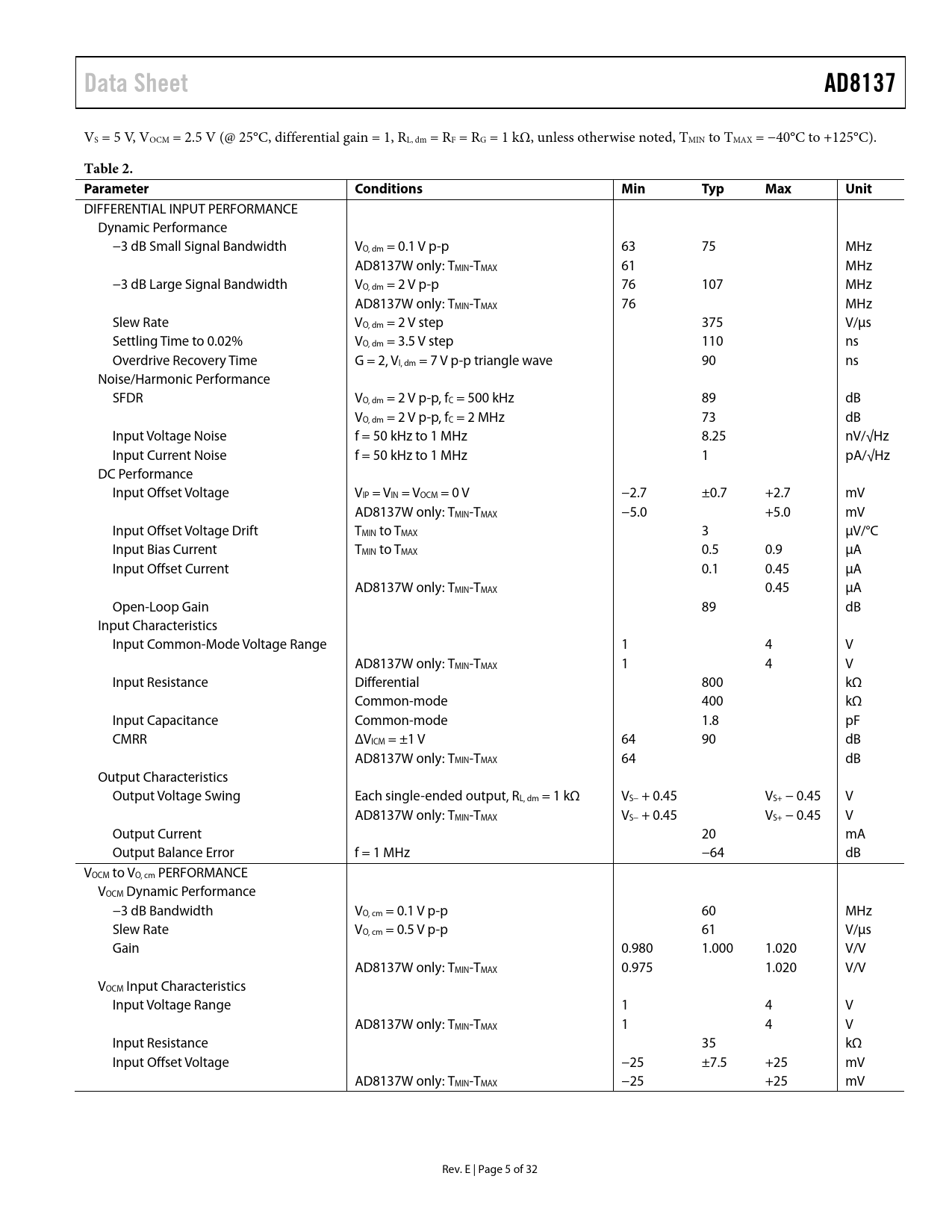 Data Sheet. AD8137. Table 2. Parameter. Conditions. Min. Typ. Max. Unit