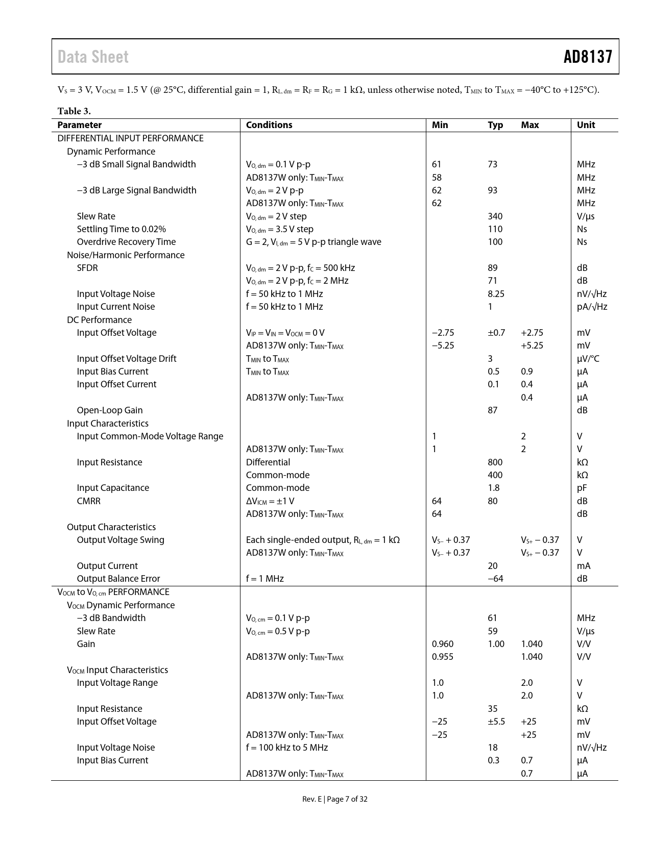 Data SheetAD8137 VS = 3 V, VOCM = 1.5 V (@ 25°C, differential gain = 1, RL, dm = RF = RG = 1 kΩ, unless otherwise noted, TMIN to TMAX = −40°C to +125°C). Table 3. ParameterConditionsMinTypMaxUnit DIFFERENTIAL INPUT PERFORMANCE Dynamic Performance −3 dB Small Signal Bandwidth VO, dm = 0.1 V p-p 61 73 MHz AD8137W only: TMIN-TMAX 58 MHz −3 dB Large Signal Bandwidth VO, dm = 2 V p-p 62 93 MHz AD8137W only: TMIN-TMAX 62 MHz Slew Rate VO, dm = 2 V step 340 V/µs Settling Time to 0.02% VO, dm = 3.5 V step 110 Ns Overdrive Recovery Time G = 2, VI, dm = 5 V p-p triangle wave 100 Ns Noise/Harmonic Performance SFDR VO, dm = 2 V p-p, fC = 500 kHz 89 dB VO, dm = 2 V p-p, fC = 2 MHz 71 dB Input Voltage Noise f = 50 kHz to 1 MHz 8.25 nV/√Hz Input Current Noise f = 50 kHz to 1 MHz 1 pA/√Hz DC Performance Input Offset Voltage VIP = VIN = VOCM = 0 V −2.75 ±0.7 +2.75 mV AD8137W only: TMIN-TMAX −5.25 +5.25 mV Input Offset Voltage Drift TMIN to TMAX 3 µV/°C Input Bias Current TMIN to TMAX 0.5 0.9 µA Input Offset Current 0.1 0.4 µA AD8137W only: TMIN-TMAX 0.4 µA Open-Loop Gain 87 dB Input Characteristics Input Common-Mode Voltage Range 1 2 V AD8137W only: TMIN-TMAX 1 2 V Input Resistance Differential 800 kΩ Common-mode 400 kΩ Input Capacitance Common-mode 1.8 pF CMRR ΔVICM = ±1 V 64 80 dB AD8137W only: TMIN-TMAX 64 dB Output Characteristics Output Voltage Swing Each single-ended output, RL, dm = 1 kΩ VS− + 0.37 VS+ − 0.37 V AD8137W only: TMIN-TMAX VS− + 0.37 VS+ − 0.37 V Output Current 20 mA Output Balance Error f = 1 MHz −64 dB VOCM to VO, cm PERFORMANCE VOCM Dynamic Performance −3 dB Bandwidth VO, cm = 0.1 V p-p 61 MHz Slew Rate VO, cm = 0.5 V p-p 59 V/µs Gain 0.960 1.00 1.040 V/V AD8137W only: TMIN-TMAX 0.955 1.040 V/V VOCM Input Characteristics Input Voltage Range 1.0 2.0 V AD8137W only: TMIN-TMAX 1.0 2.0 V Input Resistance 35 kΩ Input Offset Voltage −25 ±5.5 +25 mV AD8137W only: TMIN-TMAX −25 +25 mV Input Voltage Noise f = 100 kHz to 5 MHz 18 nV/√Hz Input Bias Current 0.3 0.7 µA AD8137W only: TMIN-TMAX 0.7 µA Rev. E | Page 7 of 32 Document Outline Features Applications Functional Block Diagram General Descripton Revision History Specifications Absolute Maximum Ratings Thermal Resistance Maximum Power Dissipation ESD Caution Pin Configuration and Function Descriptions Typical Performance Characteristics Test Circuits Theory of Operation Applications Information Analyzing a Typical Application with Matched RF and RG Networks Typical Connection and Definition of Terms Output Balance Estimating Noise, Gain, and Bandwith with Matched Feedback Networks Estimating Output Noise Voltage and Bandwidth Voltage Gain Feedback Factor Notation Input Common-Mode Voltage Calculating Input Impedance Input Common-Mode Swing Considerations Bandwidth vs. Closed-Loop Gain Estimating DC Errors Additional Impact of Mismatches in the Feedback Networks Driving a Capacitive Load Layout Considerations Terminating a Single-Ended Input Power-Down Driving an ADC with Greater than 12-Bit Performance Outline Dimensions Ordering Guide Automotive Products