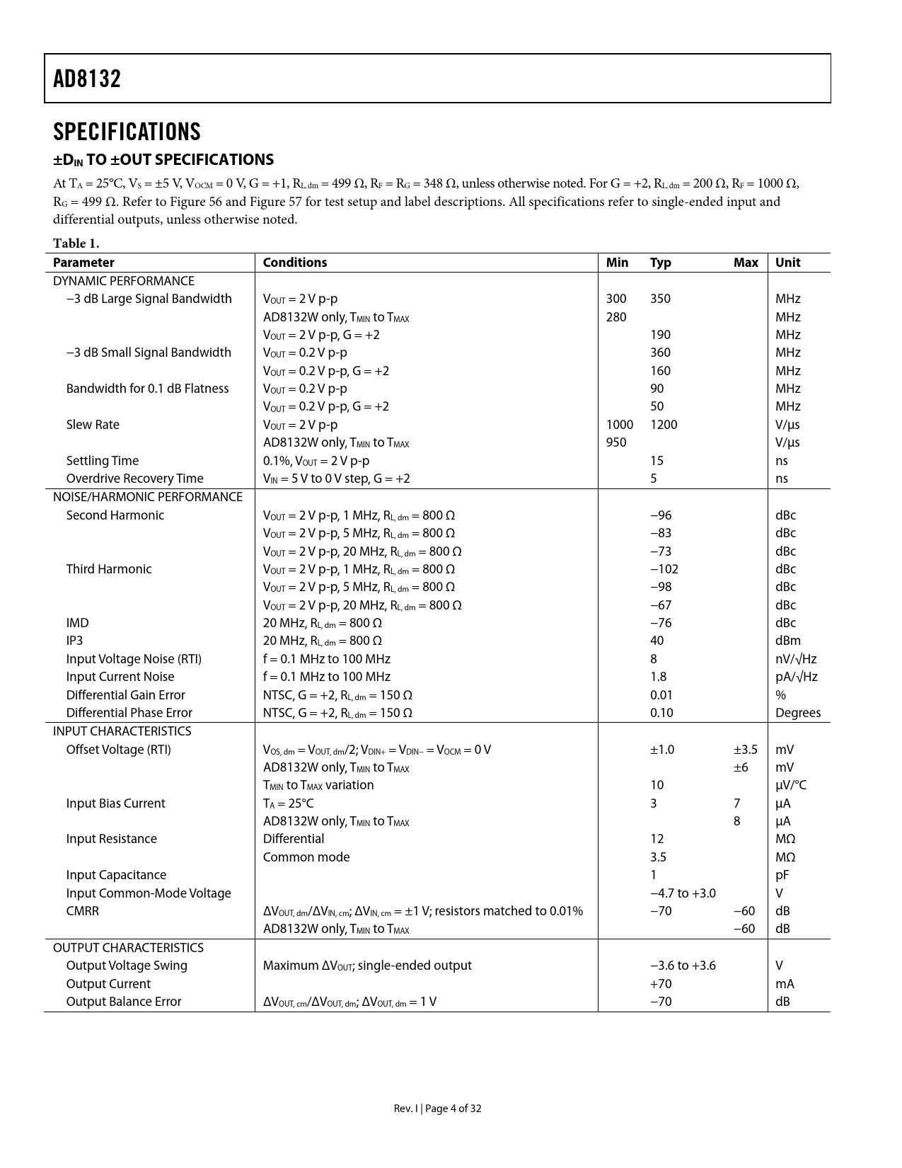 AD8132. SPECIFICATIONS ±DIN TO ±OUT SPECIFICATIONS. Table 1. Parameter Conditions. Min. Typ. Max. Unit