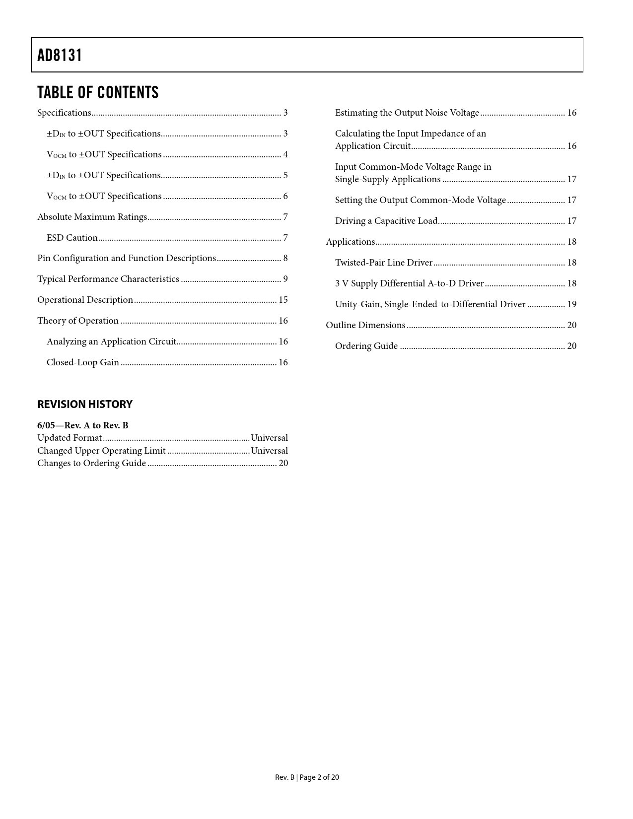 Seiten / Seite21 / 3 — AD8131. TABLE OF CONTENTS. REVISION HISTORY. 6/05—Rev. A to Rev. B