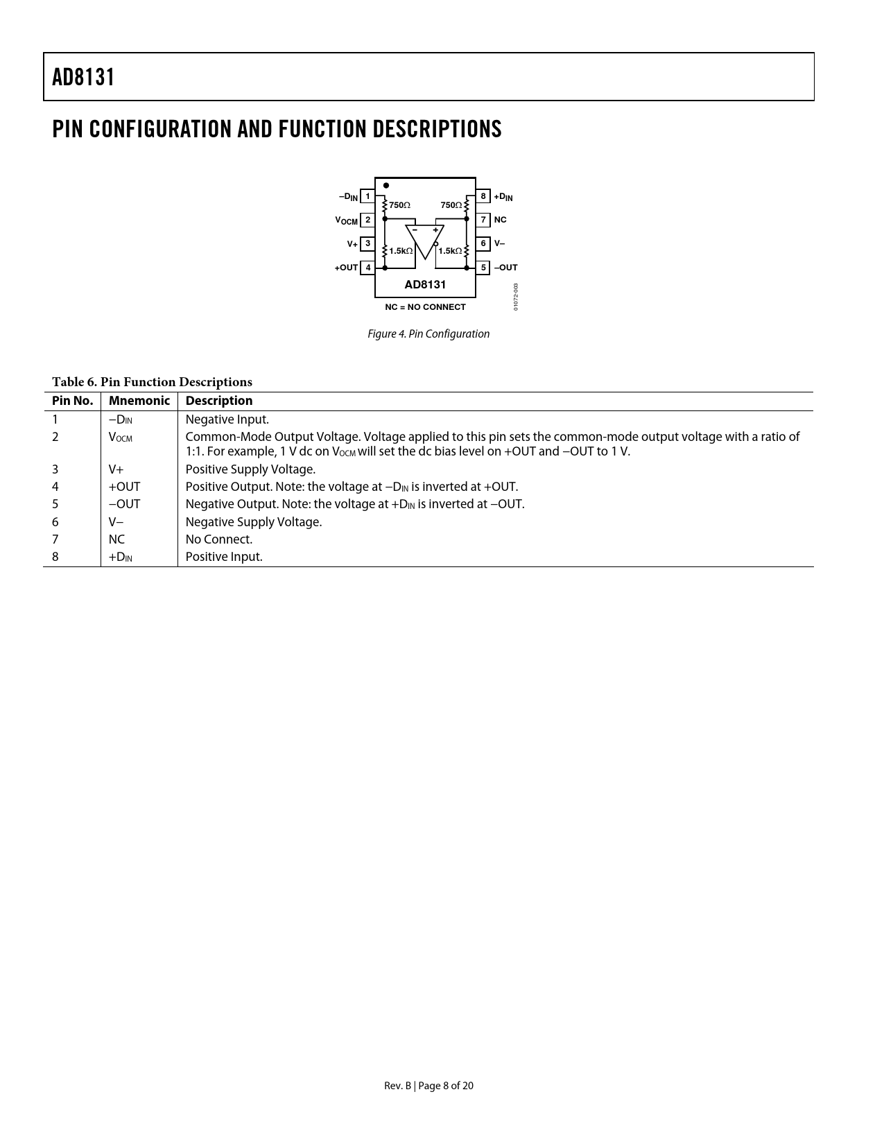 AD8131 PIN CONFIGURATION AND FUNCTION DESCRIPTIONS –D 1 8 IN +DIN 750