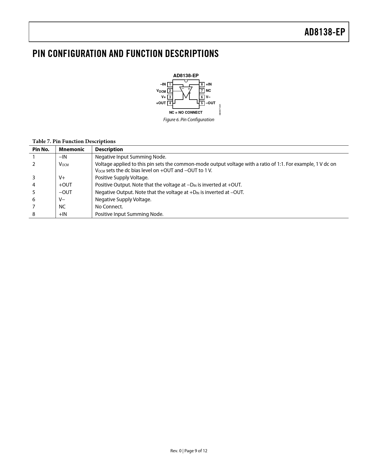 AD8138-EP PIN CONFIGURATION AND FUNCTION DESCRIPTIONS AD8138-EP –IN 1 8 +IN VOCM 2 7 NC V+ 3 6 V– +OUT 4 5 –OUT