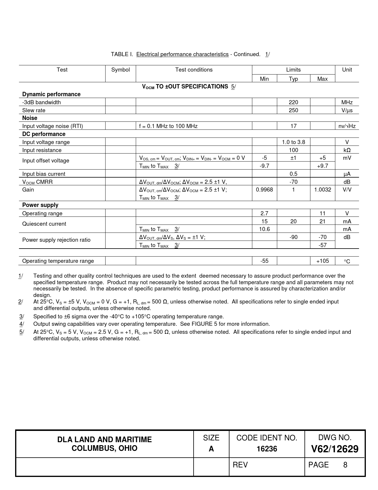 VOCM TO ±OUT SPECIFICATIONS Dynamic performance Noise DC performance Power supply DLA LAND AND MARITIME COLUMBUS, OHIO 16236