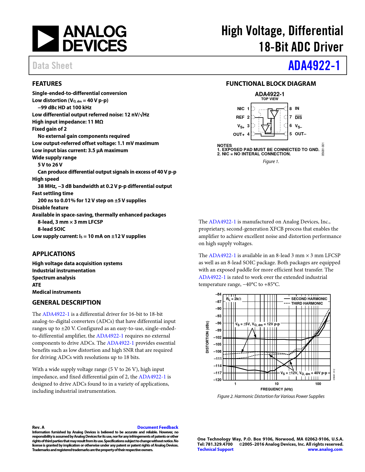 High Voltage, Differential. 18-Bit ADC Driver. Data Sheet. ADA4922-1. FEATURES. FUNCTIONAL BLOCK DIAGRAM