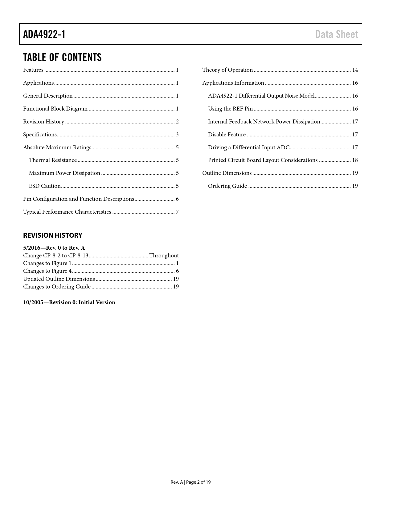 link to page 1 link to page 1 link to page 1 link to page 1 link to page 3 link to page 4 link to page 6 link to page 6 link to page 6 link to page 6 link to page 7 link to page 8 link to page 15 link to page 17 link to page 17 link to page 17 link to page 18 link to page 18 link to page 18 link to page 19 link to page 20 link to page 20 ADA4922-1Data SheetTABLE OF CONTENTS Features .. 1 Theory of Operation .. 14 Applications ... 1 Applications Information .. 16 General Description ... 1 ADA4922-1 Differential Output Noise Model .. 16 Functional Block Diagram .. 1 Using the REF Pin .. 16 Revision History ... 2 Internal Feedback Network Power Dissipation .. 17 Specifications ... 3 Disable Feature ... 17 Absolute Maximum Ratings .. 5 Driving a Differential Input ADC .. 17 Thermal Resistance .. 5 Printed Circuit Board Layout Considerations ... 18 Maximum Power Dissipation ... 5 Outline Dimensions ... 19 ESD Caution .. 5 Ordering Guide .. 19 Pin Configuration and Function Descriptions ... 6 Typical Performance Characteristics ... 7 REVISION HISTORY5/2016—Rev. 0 to Rev. A Change CP-8-2 to CP-8-13 ... Throughout Changes to Figure 1 .. 1 Changes to Figure 4 .. 6 Updated Outline Dimensions ... 19 Changes to Ordering Guide .. 19 10/2005—Revision 0: Initial Version Rev. A | Page 2 of 19 Document Outline FEATURES APPLICATIONS FUNCTIONAL BLOCK DIAGRAM GENERAL DESCRIPTION TABLE OF CONTENTS REVISION HISTORY SPECIFICATIONS ABSOLUTE MAXIMUM RATINGS THERMAL RESISTANCE MAXIMUM POWER DISSIPATION ESD CAUTION PIN CONFIGURATION AND FUNCTION DESCRIPTIONS TYPICAL PERFORMANCE CHARACTERISTICS THEORY OF OPERATION APPLICATIONS INFORMATION ADA4922-1 DIFFERENTIAL OUTPUT NOISE MODEL USING THE REF PIN INTERNAL FEEDBACK NETWORK POWER DISSIPATION DISABLE FEATURE DRIVING A DIFFERENTIAL INPUT ADC PRINTED CIRCUIT BOARD LAYOUT CONSIDERATIONS OUTLINE DIMENSIONS ORDERING GUIDE
