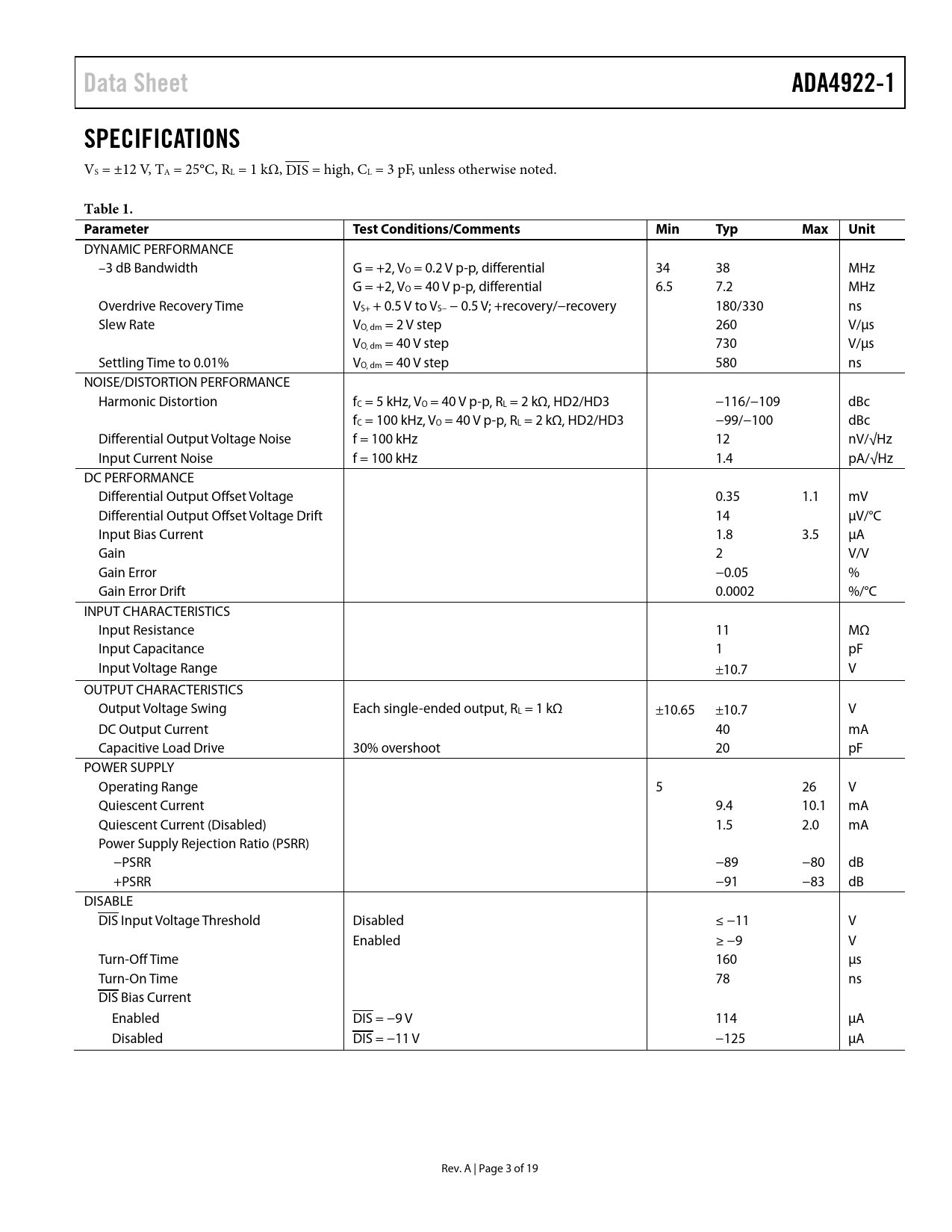 Data Sheet. ADA4922-1. SPECIFICATIONS. Table 1. Parameter. Test Conditions/Comments. Min. Typ. Max. Unit