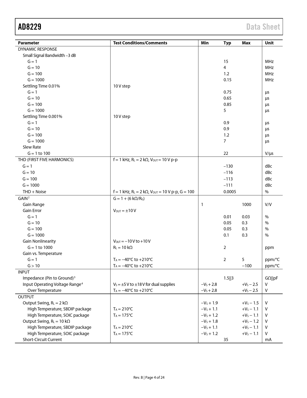 link to page 6 link to page 6 link to page 6 AD8229Data SheetParameterTest Conditions/CommentsMinTypMaxUnit DYNAMIC RESPONSE Small Signal Bandwidth –3 dB G = 1 15 MHz G = 10 4 MHz G = 100 1.2 MHz G = 1000 0.15 MHz Settling Time 0.01% 10 V step G = 1 0.75 µs G = 10 0.65 µs G = 100 0.85 µs G = 1000 5 µs Settling Time 0.001% 10 V step G = 1 0.9 µs G = 10 0.9 µs G = 100 1.2 µs G = 1000 7 µs Slew Rate G = 1 to 100 22 V/µs THD (FIRST FIVE HARMONICS) f = 1 kHz, RL = 2 kΩ, VOUT = 10 V p-p G = 1 –130 dBc G = 10 –116 dBc G = 100 –113 dBc G = 1000 –111 dBc THD + Noise f = 1 kHz, RL = 2 kΩ, VOUT = 10 V p-p, G = 100 0.0005 % GAIN2 G = 1 + (6 kΩ/RG) Gain Range 1 1000 V/V Gain Error VOUT = ±10 V G = 1 0.01 0.03 % G = 10 0.05 0.3 % G = 100 0.05 0.3 % G = 1000 0.1 0.3 % Gain Nonlinearity VOUT = −10 V to +10 V G = 1 to 1000 RL = 10 kΩ 2 ppm Gain vs. Temperature G = 1 TA = −40°C to +210°C 2 5 ppm/°C G > 10 TA = −40°C to +210°C −100 ppm/°C INPUT Impedance (Pin to Ground)3 1.5||3 GΩ||pF Input Operating Voltage Range4 VS = ±5 V to ±18 V for dual supplies −VS + 2.8 +VS − 2.5 V Over Temperature TA = −40°C to +210°C −VS + 2.8 +VS − 2.5 V OUTPUT Output Swing, RL = 2 kΩ −VS + 1.9 +VS − 1.5 V High Temperature, SBDIP package TA = 210°C −VS + 1.1 +VS − 1.1 V High Temperature, SOIC package TA = 175°C −VS + 1.2 +VS − 1.1 V Output Swing, RL = 10 kΩ −VS + 1.8 +VS − 1.2 V High Temperature, SBDIP package TA = 210°C −VS + 1.1 +VS − 1.1 V High Temperature, SOIC package TA = 175°C −VS + 1.2 +VS − 1.1 V Short-Circuit Current 35 mA Rev. B | Page 4 of 24 Document Outline Features Applications Functional Block Diagram General Description Revision History Specifications Absolute Maximum Ratings Predicted Lifetime vs. Operating Temperature Thermal Resistance ESD Caution Pin Configuration and Function Descriptions Typical Performance Characteristics Theory of Operation Architecture Gain Selection RG Power Dissipation Reference Terminal Input Voltage Range Layout Common-Mode Rejection Ratio over Frequency Power Supplies Reference Pin Input Bias Current Return Path Input Protection Input Voltages Beyond the Rails Large Differential Input Voltage at High Gain IMAX Radio Frequency Interference (RFI) Calculating the Noise of the Input Stage Source Resistance Noise Voltage Noise of the Instrumentation Amplifier Current Noise of the Instrumentation Amplifier Total Noise Density Calculation Outline Dimensions Ordering Guide