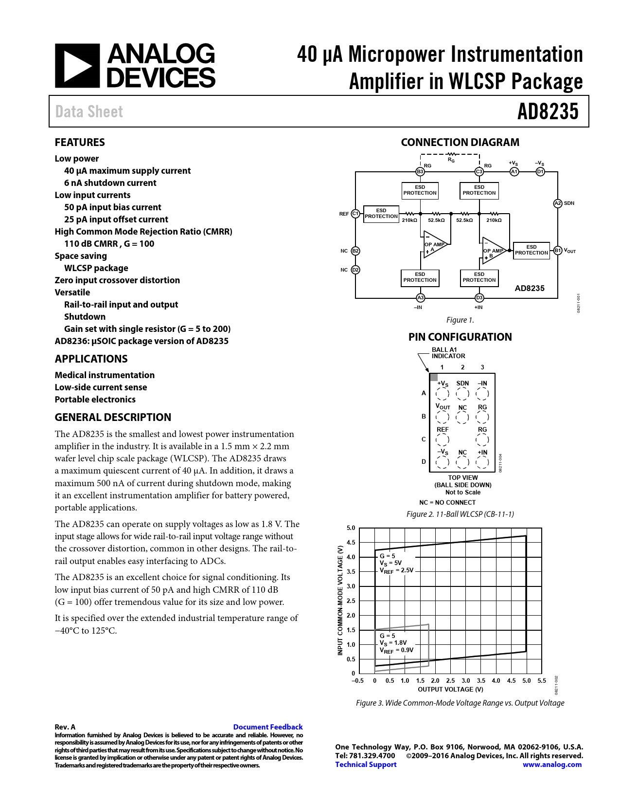 40 μA Micropower Instrumentation. Amplifier in WLCSP Package. Data Sheet. AD8235. FEATURES. CONNECTION DIAGRAM. Low power
