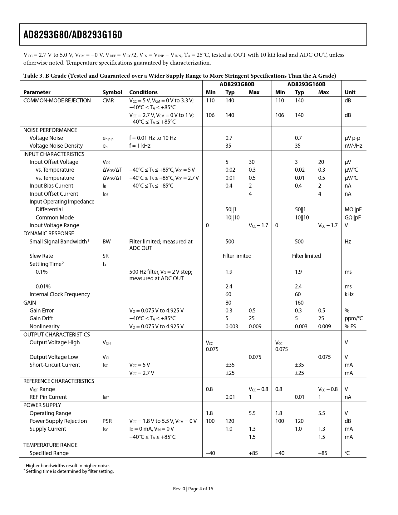 Table 3. B Grade (Tested and Guaranteed over a Wider Supply Range to More Stringent Specifications Than the A Grade) AD8293G80B AD8293G160B Parameter Symbol Conditions Min Typ Max Min Typ Max Unit