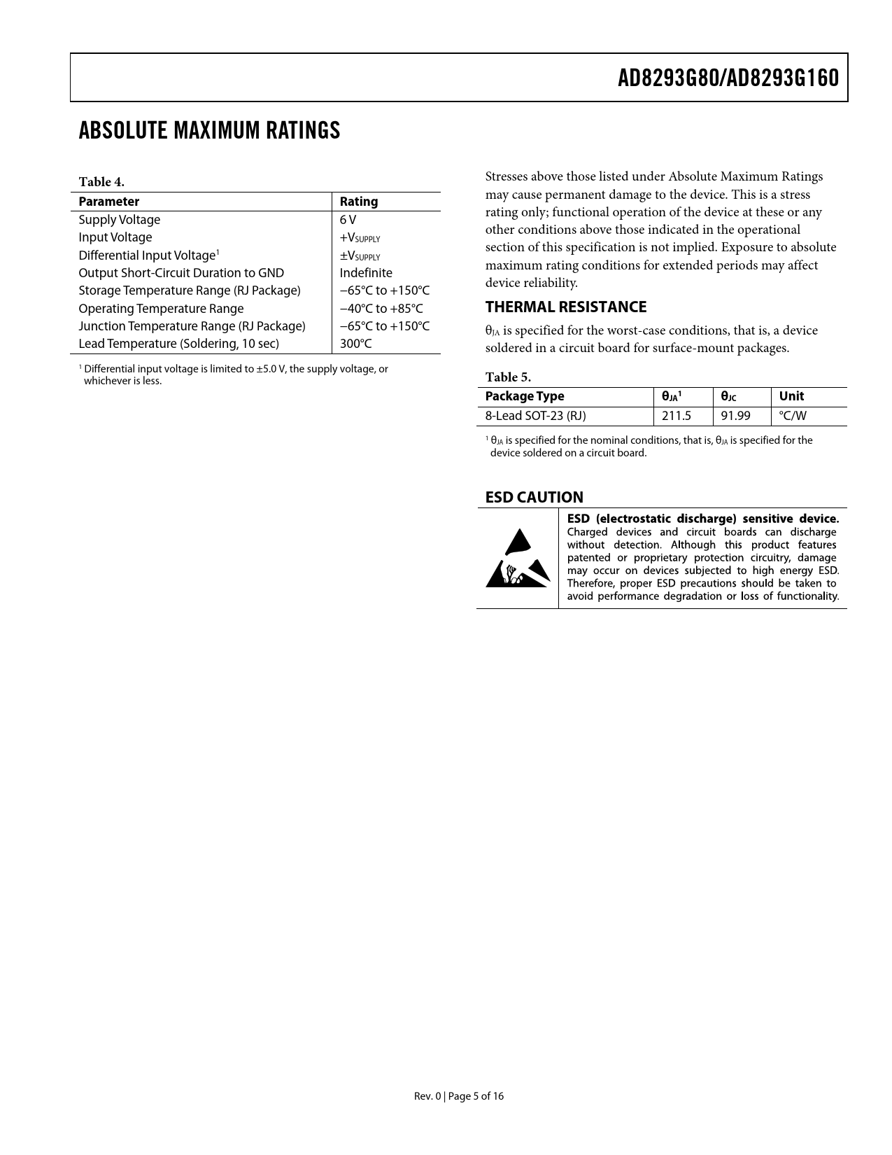 link to page 5 link to page 5 AD8293G80/AD8293G160ABSOLUTE MAXIMUM RATINGSTable 4. Stresses above those listed under Absolute Maximum Ratings may cause permanent damage to the device. This is a stress Parameter Rating rating only; functional operation of the device at these or any Supply Voltage 6 V other conditions above those indicated in the operational Input Voltage +VSUPPLY section of this specification is not implied. Exposure to absolute Differential Input Voltage1 ±VSUPPLY maximum rating conditions for extended periods may affect Output Short-Circuit Duration to GND Indefinite device reliability. Storage Temperature Range (RJ Package) −65°C to +150°C Operating Temperature Range −40°C to +85°C THERMAL RESISTANCE Junction Temperature Range (RJ Package) −65°C to +150°C θJA is specified for the worst-case conditions, that is, a device Lead Temperature (Soldering, 10 sec) 300°C soldered in a circuit board for surface-mount packages. 1 Differential input voltage is limited to ±5.0 V, the supply voltage, or whichever is less. Table 5. Package Typeθ 1JAθJC Unit 8-Lead SOT-23 (RJ) 211.5 91.99 °C/W 1 θJA is specified for the nominal conditions, that is, θJA is specified for the device soldered on a circuit board. ESD CAUTION Rev. 0 | Page 5 of 16 Document Outline FEATURES APPLICATIONS GENERAL DESCRIPTION FUNCTIONAL BLOCK DIAGRAM TABLE OF CONTENTS REVISION HISTORY SPECIFICATIONS ELECTRICAL CHARACTERISTICS ABSOLUTE MAXIMUM RATINGS THERMAL RESISTANCE ESD CAUTION PIN CONFIGURATION AND FUNCTION DESCRIPTIONS TYPICAL PERFORMANCE CHARACTERISTICS THEORY OF OPERATION HIGH PSR AND CMR 1/f NOISE CORRECTION APPLICATIONS INFORMATION OVERVIEW REFERENCE CONNECTION OUTPUT FILTERING CLOCK FEEDTHROUGH POWER SUPPLY BYPASSING INPUT OVERVOLTAGE PROTECTION OUTLINE DIMENSIONS ORDERING GUIDE