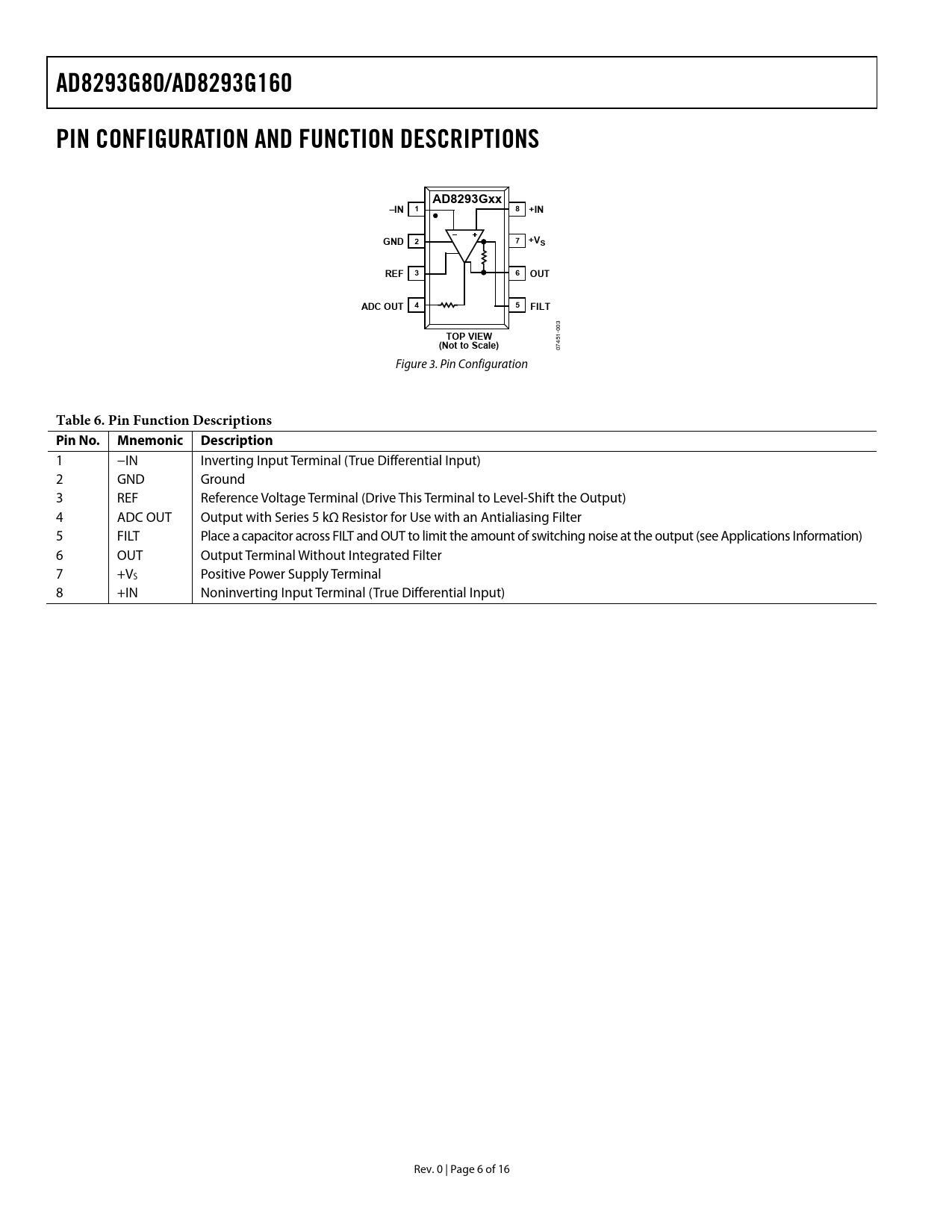 AD8293G80/AD8293G160. PIN CONFIGURATION AND FUNCTION DESCRIPTIONS. AD8293Gxx. –IN. +IN. GND. +VS. REF. OUT. ADC OUT. FILT. TOP VIEW