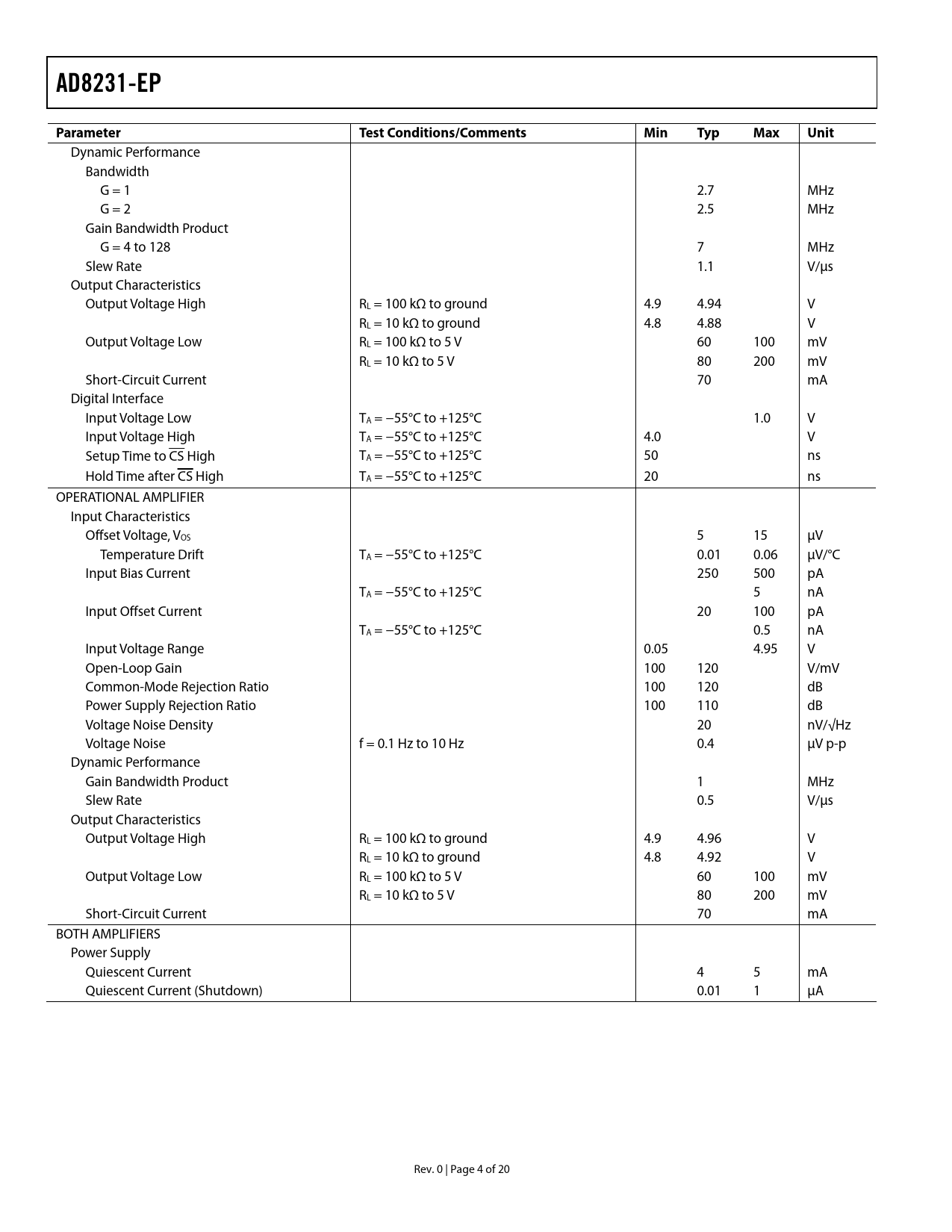 AD8231-EPParameter TestConditions/CommentsMinTypMaxUnit Dynamic Performance Bandwidth G = 1 2.7 MHz G = 2 2.5 MHz Gain Bandwidth Product G = 4 to 128 7 MHz Slew Rate 1.1 V/μs Output Characteristics Output Voltage High RL = 100 kΩ to ground 4.9 4.94 V RL = 10 kΩ to ground 4.8 4.88 V Output Voltage Low RL = 100 kΩ to 5 V 60 100 mV RL = 10 kΩ to 5 V 80 200 mV Short-Circuit Current 70 mA Digital Interface Input Voltage Low TA = −55°C to +125°C 1.0 V Input Voltage High TA = −55°C to +125°C 4.0 V Setup Time to CS High TA = −55°C to +125°C 50 ns Hold Time after CS High TA = −55°C to +125°C 20 ns OPERATIONAL AMPLIFIER Input Characteristics Offset Voltage, VOS 5 15 μV Temperature Drift TA = −55°C to +125°C 0.01 0.06 μV/°C Input Bias Current 250 500 pA TA = −55°C to +125°C 5 nA Input Offset Current 20 100 pA TA = −55°C to +125°C 0.5 nA Input Voltage Range 0.05 4.95 V Open-Loop Gain 100 120 V/mV Common-Mode Rejection Ratio 100 120 dB Power Supply Rejection Ratio 100 110 dB Voltage Noise Density 20 nV/√Hz Voltage Noise f = 0.1 Hz to 10 Hz 0.4 μV p-p Dynamic Performance Gain Bandwidth Product 1 MHz Slew Rate 0.5 V/μs Output Characteristics Output Voltage High RL = 100 kΩ to ground 4.9 4.96 V RL = 10 kΩ to ground 4.8 4.92 V Output Voltage Low RL = 100 kΩ to 5 V 60 100 mV RL = 10 kΩ to 5 V 80 200 mV Short-Circuit Current 70 mA BOTH AMPLIFIERS Power Supply Quiescent Current 4 5 mA Quiescent Current (Shutdown) 0.01 1 μA Rev. 0 | Page 4 of 20 Document Outline FEATURES ENHANCED PRODUCT FEATURES FUNCTIONAL BLOCK DIAGRAM GENERAL DESCRIPTION TABLE OF CONTENTS REVISION HISTORY SPECIFICATIONS ABSOLUTE MAXIMUM RATINGS THERMAL RESISTANCE MAXIMUM POWER DISSIPATION ESD CAUTION PIN CONFIGURATION AND FUNCTION DESCRIPTIONS TYPICAL PERFORMANCE CHARACTERISTICS INSTRUMENTATION AMPLIFIER PERFORMANCE CURVES OPERATIONAL AMPLIFIER PERFORMANCE CURVES PERFORMANCE CURVES VALID FOR BOTH AMPLIFIERS OUTLINE DIMENSIONS ORDERING GUIDE