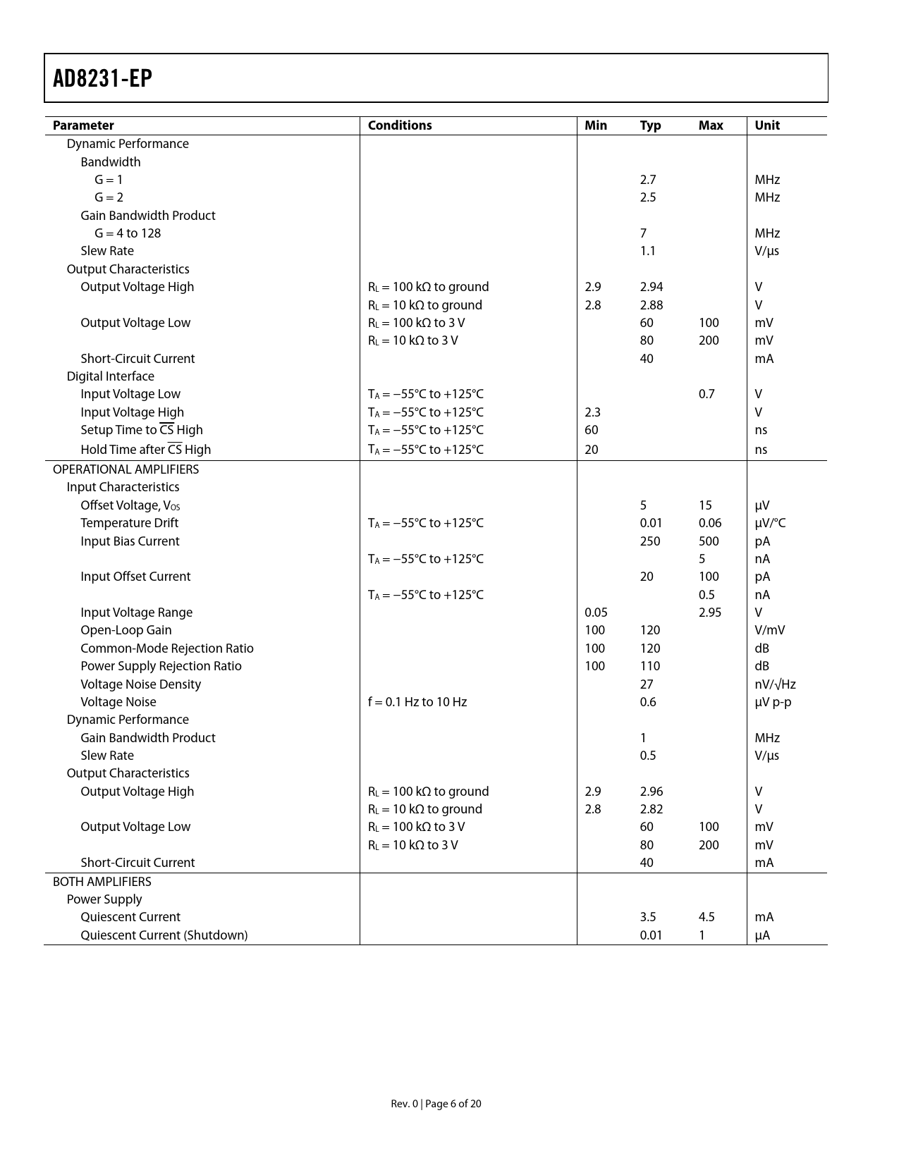 AD8231-EP. Parameter Conditions. Min. Typ. Max. Unit