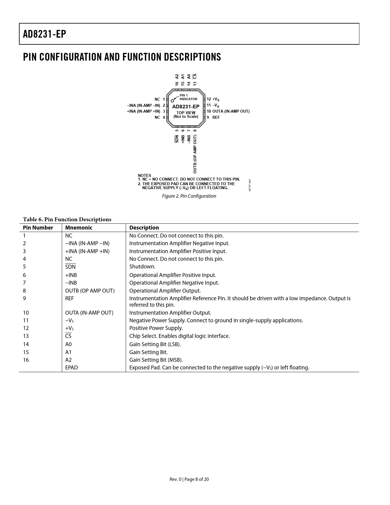 AD8231-EPPIN CONFIGURATION AND FUNCTION DESCRIPTIONS210SAAAC65411131PIN 1NC 1INDICATOR12 +VS–INA (IN-AMP –IN) 211 –VSAD8231-EP+INA (IN-AMP +IN) 310 OUTA (IN-AMP OUT)TOP VIEWNC 4(Not to Scale)9 REF5678NBB)DNNTSIIU+–O PMA PO( BTUONOTES1. NC = NO CONNECT. DO NOT CONNECT TO THIS PIN. 02 0 2. THE EXPOSED PAD CAN BE CONNECTED TO THE 7- NEGATIVE SUPPLY (–V 70 S) OR LEFT FLOATING. 09 Figure 2. Pin Configuration Table 6. Pin Function Descriptions Pin NumberMnemonicDescription 1 NC No Connect. Do not connect to this pin. 2 −INA (IN-AMP −IN) Instrumentation Amplifier Negative Input. 3 +INA (IN-AMP +IN) Instrumentation Amplifier Positive Input. 4 NC No Connect. Do not connect to this pin. 5 SDN Shutdown. 6 +INB Operational Amplifier Positive Input. 7 −INB Operational Amplifier Negative Input. 8 OUTB (OP AMP OUT) Operational Amplifier Output. 9 REF Instrumentation Amplifier Reference Pin. It should be driven with a low impedance. Output is referred to this pin. 10 OUTA (IN-AMP OUT) Instrumentation Amplifier Output. 11 −VS Negative Power Supply. Connect to ground in single-supply applications. 12 +VS Positive Power Supply. 13 CS Chip Select. Enables digital logic interface. 14 A0 Gain Setting Bit (LSB). 15 A1 Gain Setting Bit. 16 A2 Gain Setting Bit (MSB). EPAD Exposed Pad. Can be connected to the negative supply (−VS) or left floating. Rev. 0 | Page 8 of 20 Document Outline FEATURES ENHANCED PRODUCT FEATURES FUNCTIONAL BLOCK DIAGRAM GENERAL DESCRIPTION TABLE OF CONTENTS REVISION HISTORY SPECIFICATIONS ABSOLUTE MAXIMUM RATINGS THERMAL RESISTANCE MAXIMUM POWER DISSIPATION ESD CAUTION PIN CONFIGURATION AND FUNCTION DESCRIPTIONS TYPICAL PERFORMANCE CHARACTERISTICS INSTRUMENTATION AMPLIFIER PERFORMANCE CURVES OPERATIONAL AMPLIFIER PERFORMANCE CURVES PERFORMANCE CURVES VALID FOR BOTH AMPLIFIERS OUTLINE DIMENSIONS ORDERING GUIDE