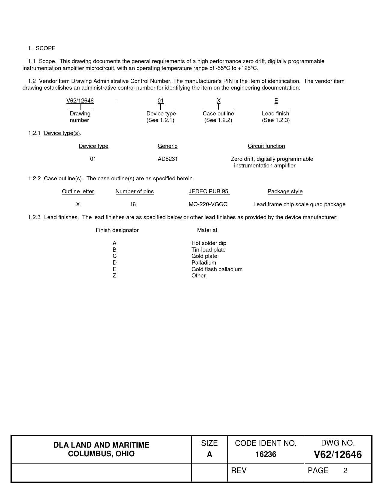 1. SCOPE 1.1 Scope. This drawing documents the general requirements of a high performance zero drift, digitally programmable instrumentation amplifier microcircuit, with an operating temperature range of -55°C to +125°C. 1.2 Vendor Item Drawing Administrative Control Number. The manufacturer’s PIN is the item of identification. The vendor item drawing establishes an administrative control number for identifying the item on the engineering documentation: V62/12646 - 01 X E Drawing Device type Case outline Lead finish number (See 1.2.1) (See 1.2.2) (See 1.2.3) 1.2.1 Device type(s). Device type Generic Circuit function 01 AD8231 Zero drift, digitally programmable instrumentation amplifier 1.2.2 Case outline(s). The case outline(s) are as specified herein. Outline letter Number of pins JEDEC PUB 95 Package style X 16 MO-220-VGGC Lead frame chip scale quad package 1.2.3 Lead finishes. The lead finishes are as specified below or other lead finishes as provided by the device manufacturer: Finish designator Material A Hot solder dip B Tin-lead plate C Gold plate D Palladium E Gold flash palladium Z Other
