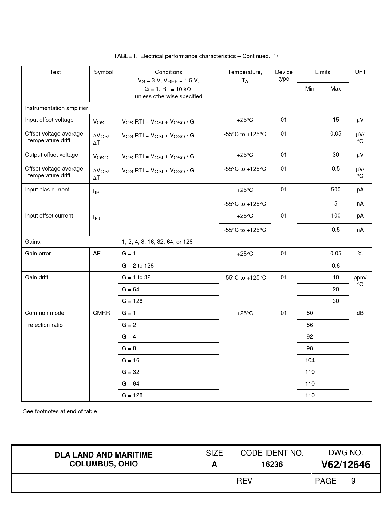 TABLE I. Electrical performance characteristics – Continued. 1/ Test Symbol Conditions Temperature, Device Limits Unit V type S = 3 V, VREF = 1.5 V, TA G = 1, R L = 10 kΩ, Min Max unless otherwise specified Instrumentation amplifier. Input offset voltage VOSI VOS RTI = VOSI + VOSO / G +25°C 01 15 µV Offset voltage average ∆VOS/ VOS RTI = VOSI + VOSO / G -55°C to +125°C 01 0.05 µV/ temperature drift ∆T °C Output offset voltage VOSO VOS RTI = VOSI + VOSO / G +25°C 01 30 µV Offset voltage average ∆VOS/ VOS RTI = VOSI + VOSO / G -55°C to +125°C 01 0.5 µV/ temperature drift ∆T °C Input bias current IIB +25°C 01 500 pA -55°C to +125°C 5 nA Input offset current IIO +25°C 01 100 pA -55°C to +125°C 0.5 nA Gains. 1, 2, 4, 8, 16, 32, 64, or 128 Gain error AE G = 1 +25°C 01 0.05 % G = 2 to 128 0.8 Gain drift G = 1 to 32 -55°C to +125°C 01 10 ppm/ °C G = 64 20 G = 128 30 Common mode CMRR G = 1 +25°C 01 80 dB rejection ratio G = 2 86 G = 4 92 G = 8 98 G = 16 104 G = 32 110 G = 64 110 G = 128 110 See footnotes at end of table.