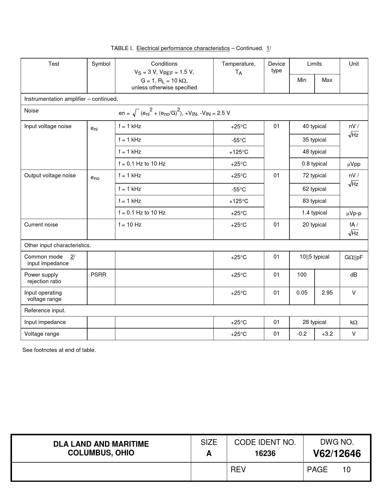 TABLE I. Electrical performance characteristics – Continued. 1/ Test Symbol Conditions Temperature, Device Limits Unit V type S = 3 V, VREF = 1.5 V, TA G = 1, R L = 10 kΩ, Min Max unless otherwise specified Instrumentation amplifier – continued. Noise 2 2 en = (eni + (eno/G) ), +VIN, -VIN = 2.5 V Input voltage noise eni f = 1 kHz +25°C 01 40 typical nV / Hz f = 1 kHz -55°C 35 typical f = 1 kHz +125°C 48 typical f = 0.1 Hz to 10 Hz +25°C 0.8 typical µVpp Output voltage noise eno f = 1 kHz +25°C 01 72 typical nV / Hz f = 1 kHz -55°C 62 typical f = 1 kHz +125°C 83 typical f = 0.1 Hz to 10 Hz +25°C 1.4 typical µVp-p Current noise f = 10 Hz +25°C 01 20 typical fA / Hz Other input characteristics. Common mode 2/ +25°C 01 10||5 typical GΩ||pF input impedance Power supply PSRR +25°C 01 100 dB rejection ratio Input operating +25°C 01 0.05 2.95 V voltage range Reference input. Input impedance +25°C 01 28 typical kΩ Voltage range +25°C 01 -0.2 +3.2 V See footnotes at end of table.