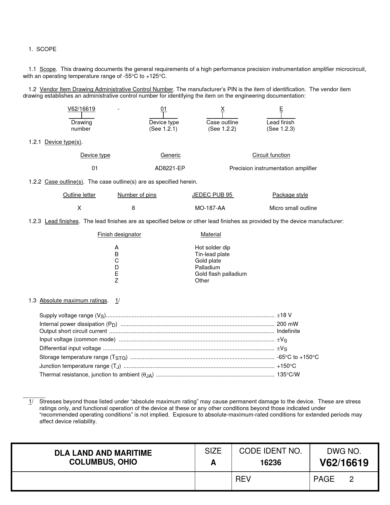 1. SCOPE 1.1 Scope. This drawing documents the general requirements of a high performance precision instrumentation amplifier microcircuit, with an operating temperature range of -55C to +125C. 1.2 Vendor Item Drawing Administrative Control Number. The manufacturer’s PIN is the item of identification. The vendor item drawing establishes an administrative control number for identifying the item on the engineering documentation: V62/16619 - 01 X E Drawing Device type Case outline Lead finish number (See 1.2.1) (See 1.2.2) (See 1.2.3) 1.2.1 Device type(s). Device type Generic Circuit function 01 AD8221-EP Precision instrumentation amplifier 1.2.2 Case outline(s). The case outline(s) are as specified herein. Outline letter Number of pins JEDEC PUB 95 Package style X 8 MO-187-AA Micro small outline 1.2.3 Lead finishes. The lead finishes are as specified below or other lead finishes as provided by the device manufacturer: Finish designator Material A Hot solder dip B Tin-lead plate C Gold plate D Palladium E Gold flash palladium Z Other 1.3 Absolute maximum ratings. 1/ Supply voltage range (VS)... 18 V Internal power dissipation (PD) .. 200 mW Output short circuit current ... Indefinite Input voltage (common mode) ... VS Differential input voltage ... VS Storage temperature range (TSTG) .. -65C to +150C Junction temperature range (TJ) .. +150C Thermal resistance, junction to ambient (JA) .. 135C/W _______ 1/ Stresses beyond those listed under “absolute maximum rating” may cause permanent damage to the device. These are stress ratings only, and functional operation of the device at these or any other conditions beyond those indicated under “recommended operating conditions” is not implied. Exposure to absolute-maximum-rated conditions for extended periods may affect device reliability.