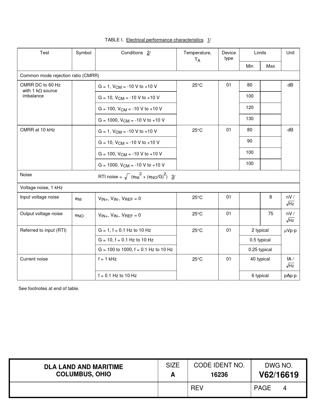TABLE I. Electrical performance characteristics. 1/ Test Symbol Conditions 2/ Temperature, Device Limits Unit T type A Min Max Common mode rejection ratio (CMRR) CMRR DC to 60 Hz G = 1, VCM = -10 V to +10 V 25C 01 80 dB with 1 k source imbalance G = 10, VCM = -10 V to +10 V 100 G = 100, VCM = -10 V to +10 V 120 G = 1000, VCM = -10 V to +10 V 130 CMRR at 10 kHz G = 1, VCM = -10 V to +10 V 25C 01 80 dB G = 10, VCM = -10 V to +10 V 90 G = 100, VCM = -10 V to +10 V 100 G = 1000, VCM = -10 V to +10 V 100 Noise 2 2 RTI noise = (eNI + (eNO/G) 3/ Voltage noise, 1 kHz Input voltage noise eNI VIN+, VIN-, VREF = 0 25C 01 8 nV / Hz Output voltage noise eNO VIN+, VIN-, VREF = 0 25C 01 75 nV / Hz Referred to input (RTI) G = 1, f = 0.1 Hz to 10 Hz 25C 01 2 typical Vp-p G = 10, f = 0.1 Hz to 10 Hz 0.5 typical G = 100 to 1000, f = 0.1 Hz to 10 Hz 0.25 typical Current noise f = 1 kHz 25C 01 40 typical fA / Hz f = 0.1 Hz to 10 Hz 6 typical pAp-p See footnotes at end of table. DLA LAND AND MARITIME SIZE CODE IDENT NO. DWG NO. COLUMBUS, OHIOA16236V62/16619 REV PAGE 4