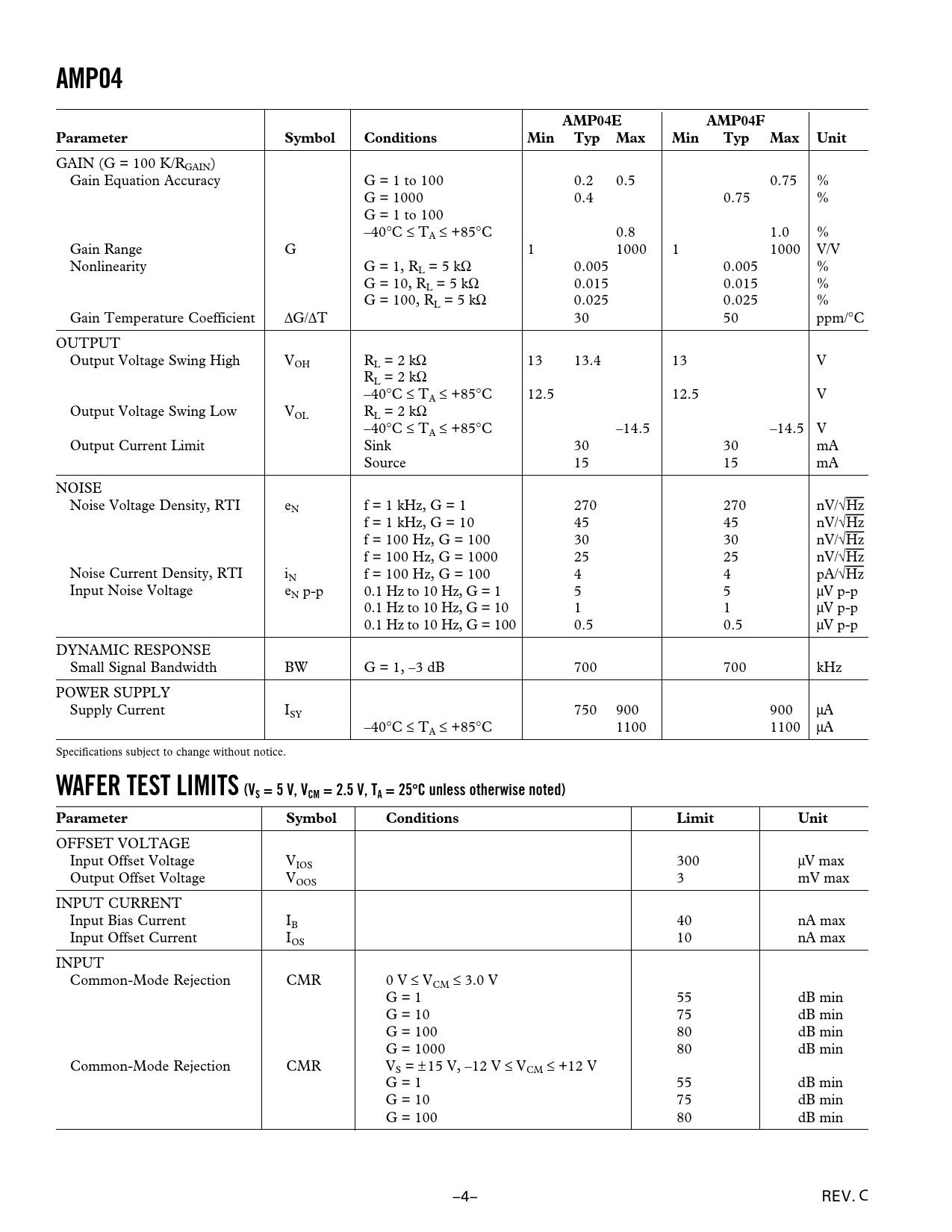 AMP04 AMP04E AMP04F Parameter Symbol Conditions Min Typ Max Unit WAFER TEST LIMITS (VS = 5 V, VCM = 2.5 V, TA = 25