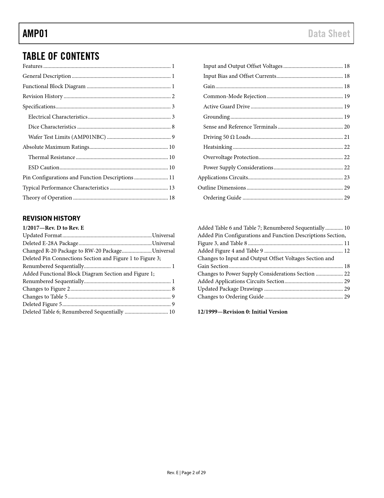 link to page 1 link to page 1 link to page 1 link to page 3 link to page 4 link to page 4 link to page 9 link to page 10 link to page 11 link to page 11 link to page 11 link to page 12 link to page 14 link to page 19 link to page 19 link to page 19 link to page 19 link to page 20 link to page 20 link to page 20 link to page 21 link to page 22 link to page 23 link to page 23 link to page 23 link to page 24 link to page 30 link to page 30 AMP01Data SheetTABLE OF CONTENTS Features .. 1 Input and Output Offset Voltages .. 18 General Description ... 1 Input Bias and Offset Currents ... 18 Functional Block Diagram .. 1 Gain .. 18 Revision History ... 2 Common-Mode Rejection .. 19 Specifications ... 3 Active Guard Drive .. 19 Electrical Characteristics ... 3 Grounding ... 19 Dice Characteristics ... 8 Sense and Reference Terminals .. 20 Wafer Test Limits (AMP01NBC) ... 9 Driving 50 Ω Loads .. 21 Absolute Maximum Ratings .. 10 Heatsinking ... 22 Thermal Resistance .. 10 Overvoltage Protection .. 22 ESD Caution .. 10 Power Supply Considerations ... 22 Pin Configurations and Function Descriptions ... 11 Applications Circuits .. 23 Typical Performance Characteristics ... 13 Outline Dimensions ... 29 Theory of Operation .. 18 Ordering Guide .. 29 REVISION HISTORY1/2017—Rev. D to Rev. E Added Table 6 and Table 7; Renumbered Sequentially ... 10 Updated Format .. Universal Added Pin Configurations and Function Descriptions Section, Deleted E-28A Package .. Universal Figure 3, and Table 8 .. 11 Changed R-20 Package to RW-20 Package .. Universal Added Figure 4 and Table 9 .. 12 Deleted Pin Connections Section and Figure 1 to Figure 3; Changes to Input and Output Offset Voltages Section and Renumbered Sequentially .. 1 Gain Section .. 18 Added Functional Block Diagram Section and Figure 1; Changes to Power Supply Considerations Section .. 22 Renumbered Sequentially .. 1 Added Applications Circuits Section ... 29 Changes to Figure 2 .. 8 Updated Package Drawings .. 29 Changes to Table 5 .. 9 Changes to Ordering Guide .. 29 Deleted Figure 5 .. 9 Deleted Table 6; Renumbered Sequentially .. 10 12/1999—Revision 0: Initial Version Rev. E | Page 2 of 29 Document Outline FEATURES GENERAL DESCRIPTION FUNCTIONAL BLOCK DIAGRAM TABLE OF CONTENTS REVISION HISTORY SPECIFICATIONS ELECTRICAL CHARACTERISTICS DICE CHARACTERISTICS WAFER TEST LIMITS (AMP01NBC) ABSOLUTE MAXIMUM RATINGS THERMAL RESISTANCE ESD CAUTION PIN CONFIGURATIONS AND FUNCTION DESCRIPTIONS TYPICAL PERFORMANCE CHARACTERISTICS THEORY OF OPERATION INPUT AND OUTPUT OFFSET VOLTAGES INPUT BIAS AND OFFSET CURRENTS GAIN COMMON-MODE REJECTION ACTIVE GUARD DRIVE GROUNDING SENSE AND REFERENCE TERMINALS DRIVING 50 Ω LOADS HEATSINKING OVERVOLTAGE PROTECTION POWER SUPPLY CONSIDERATIONS APPLICATIONS CIRCUITS OUTLINE DIMENSIONS ORDERING GUIDE